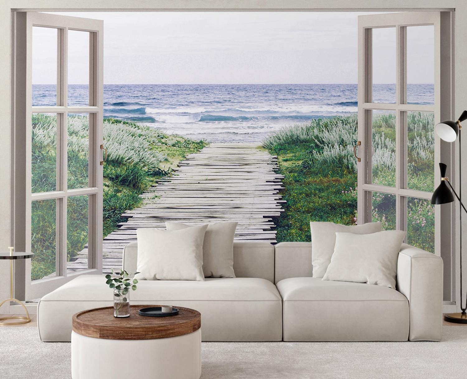 - Moderne decoratieve fotomuurschildering: Uitzicht op het strand vanuit het raam.