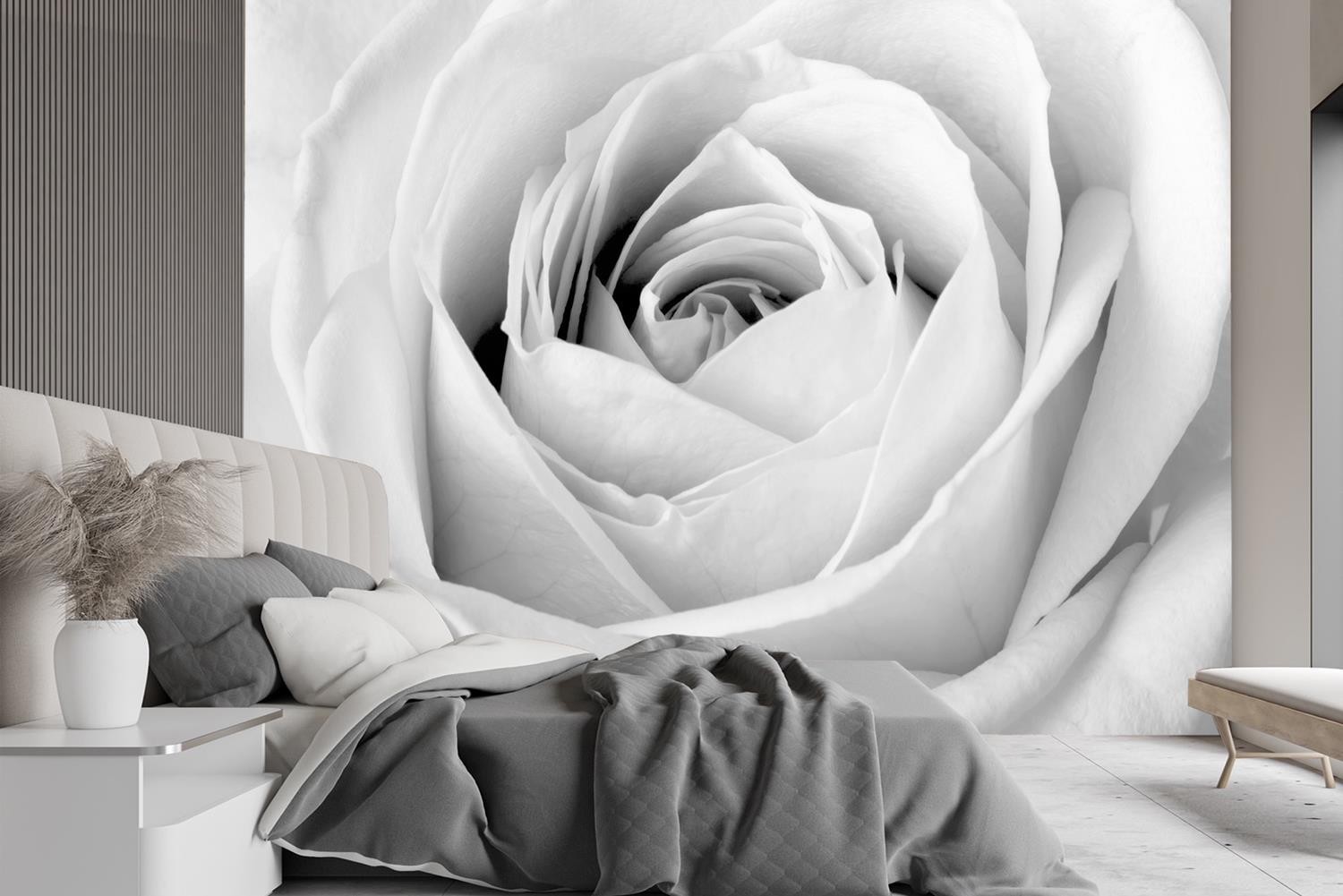 Muurfoto voor woonkamer met afbeelding van witte roos in zwart-witte kleur