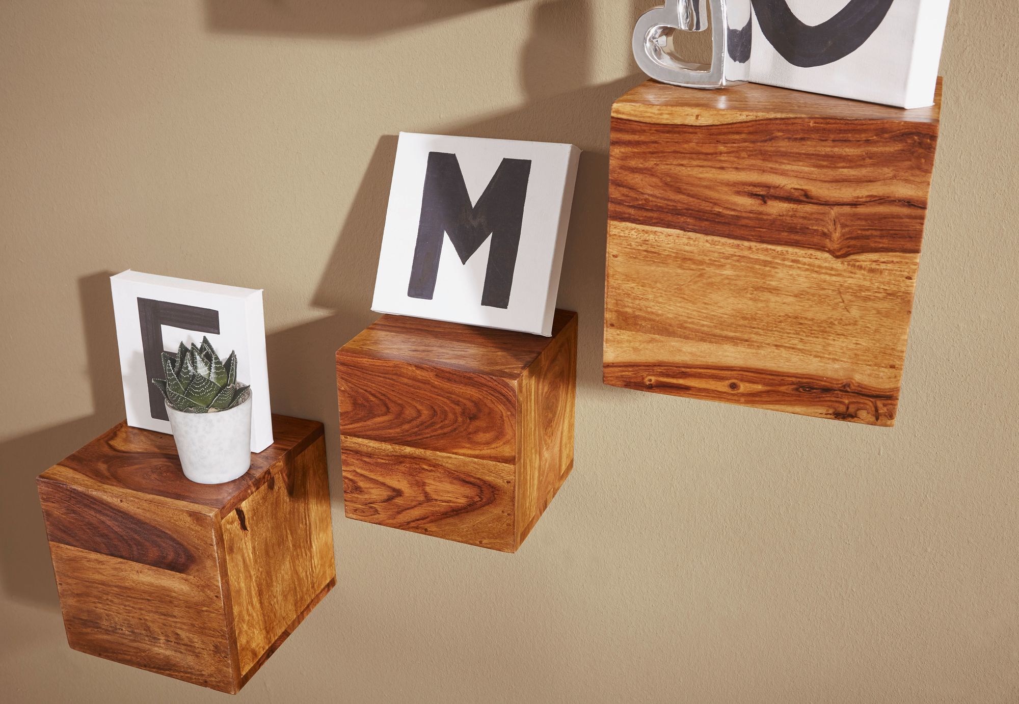 Productinformatie "4-delige MUMBAI Wandplanken | Massief Sheeshamhout Natuurlijk | 25x25x25 cm & 20x20x20 cm"
