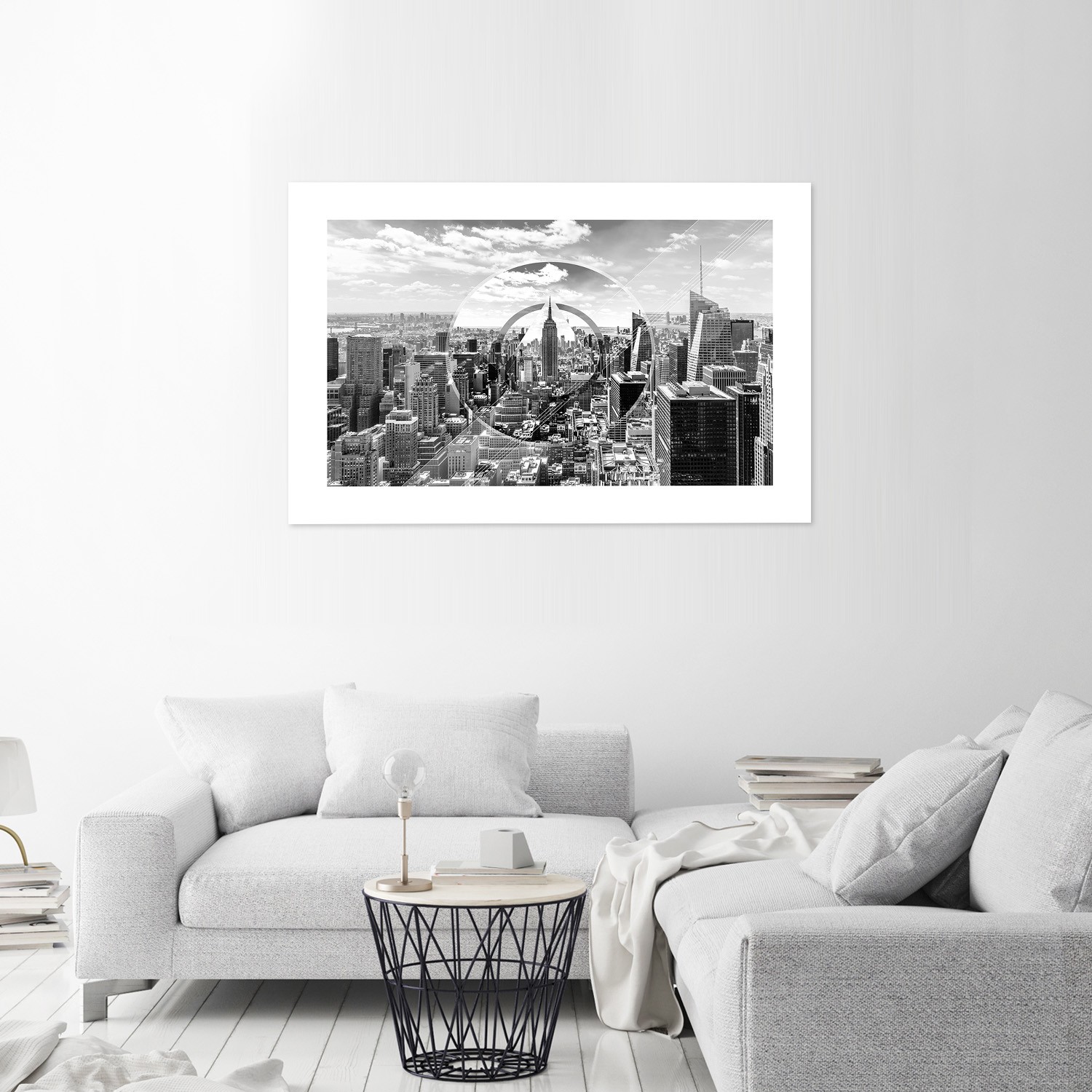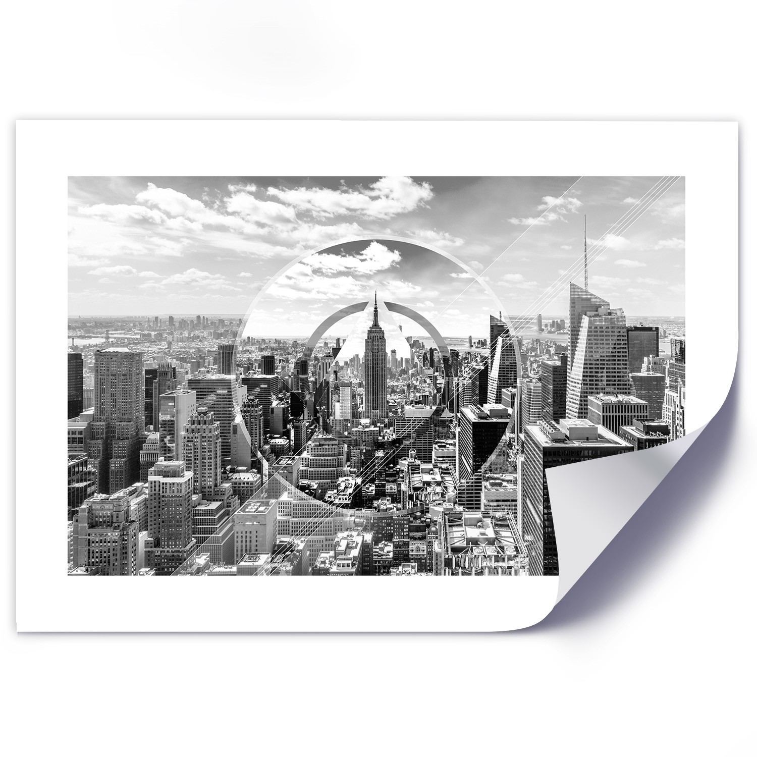 Wandposter met decoratieve afbeelding van wolkenkrabbers in grijstinten