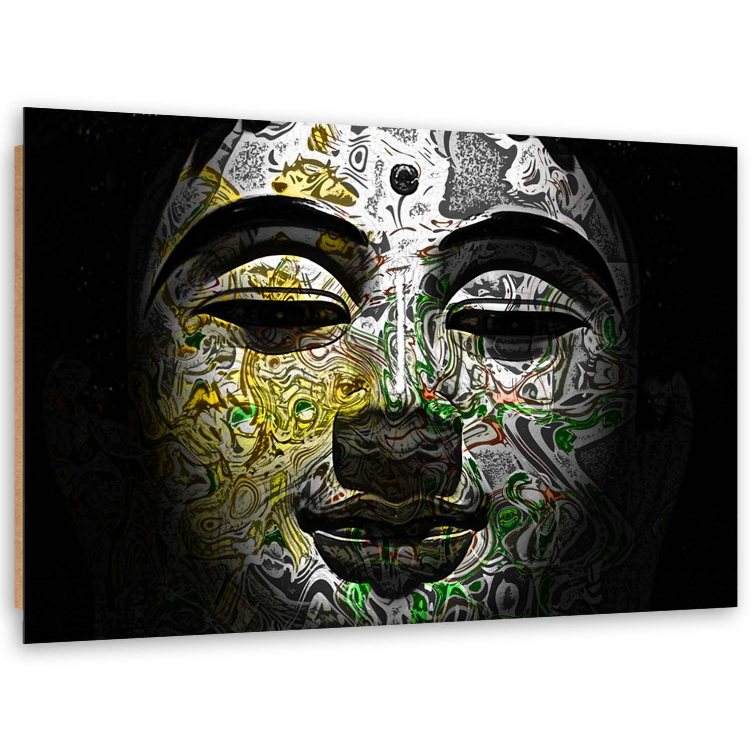 Beschrijving en kenmerken - Decoratief HDF-frame met afbeelding van Boeddhahoofd in donkere tinten