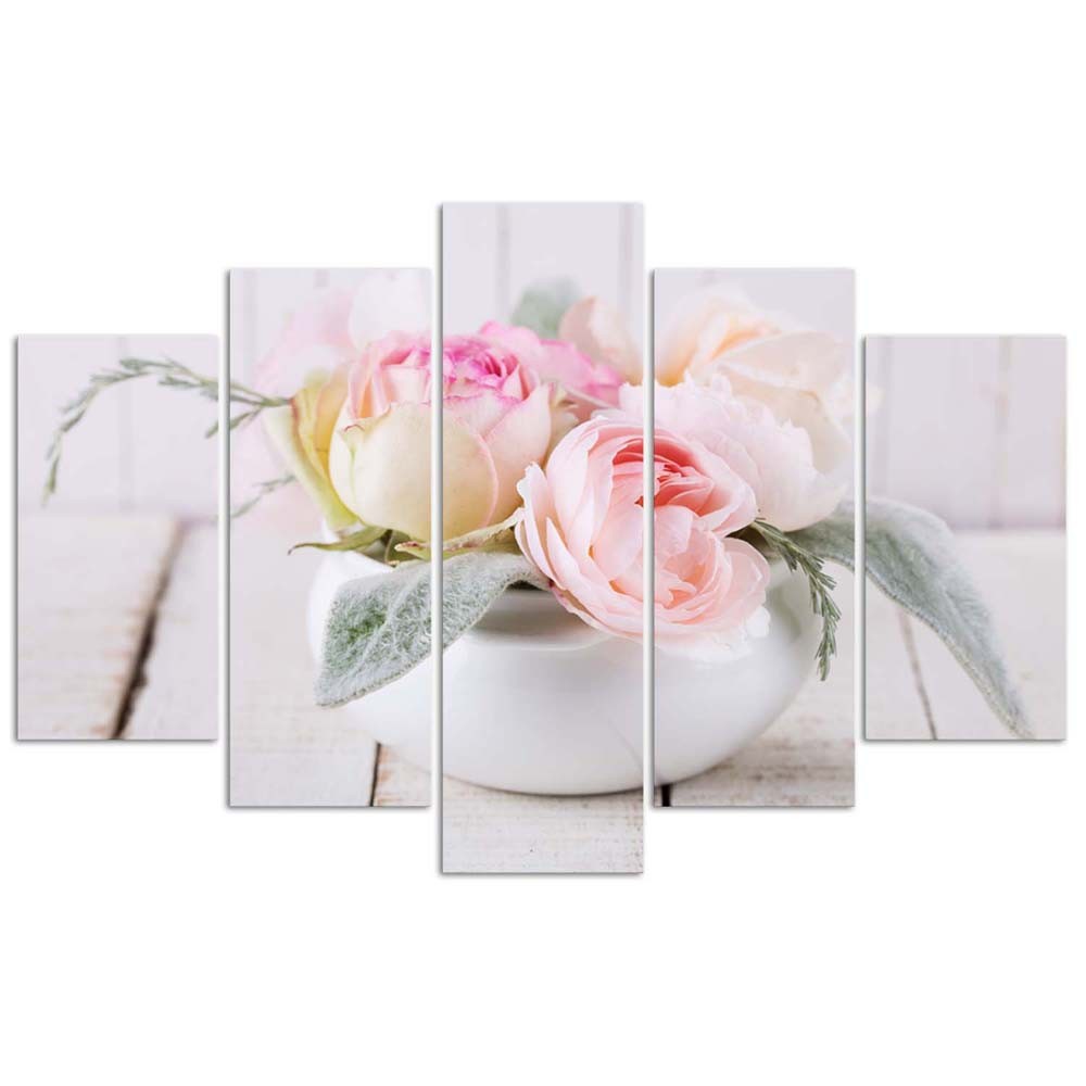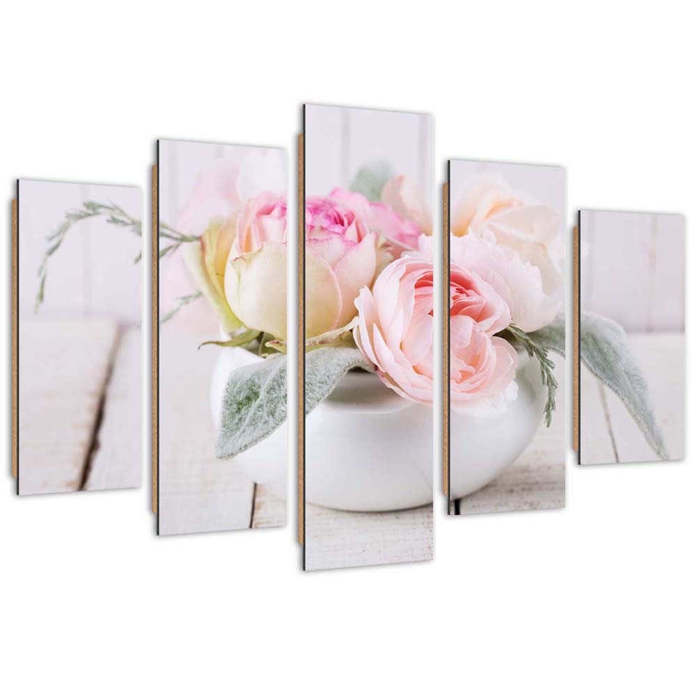 - Frame bestaande uit vijf stukken “rozen in een witte vaas” gedrukt op MDF-canvas (medium density fiber).