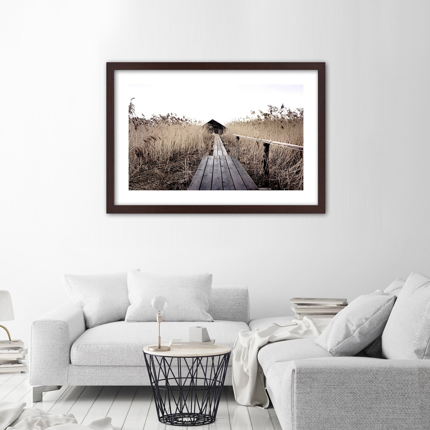 Frame van een landschap met ponton gedrukt op mdf-papier met bruine en witte kleurafwerking