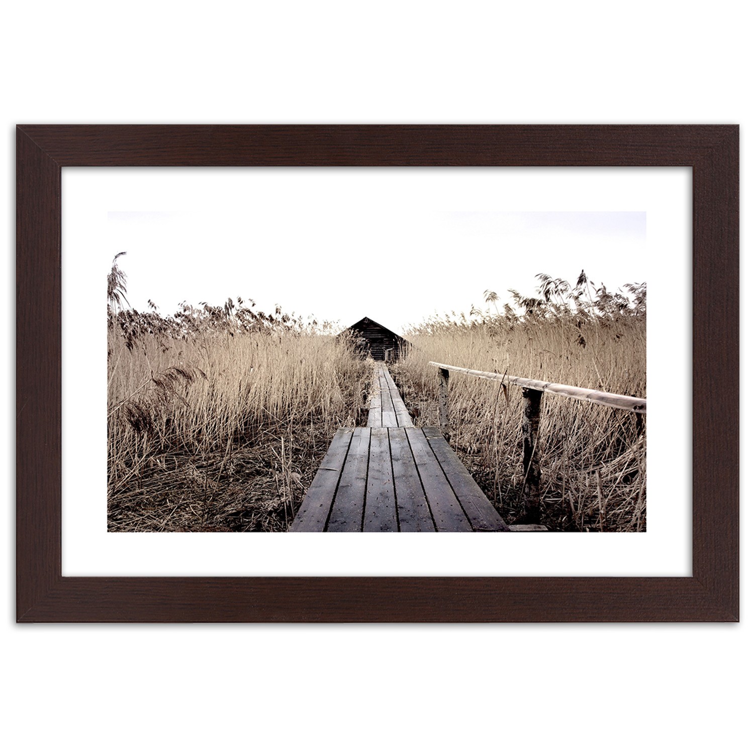 Productinformatie "Frame van een landschap met ponton gedrukt op mdf-papier met bruine en witte kleurafwerking"