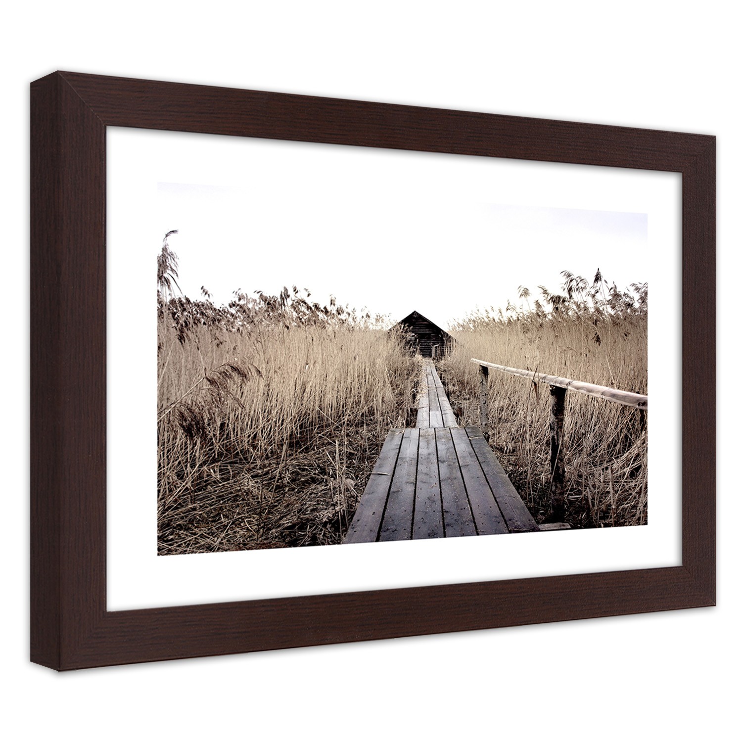 Beschrijving en kenmerken - Frame van een landschap met ponton gedrukt op MDF-papier met bruine en witte kleurafwerking