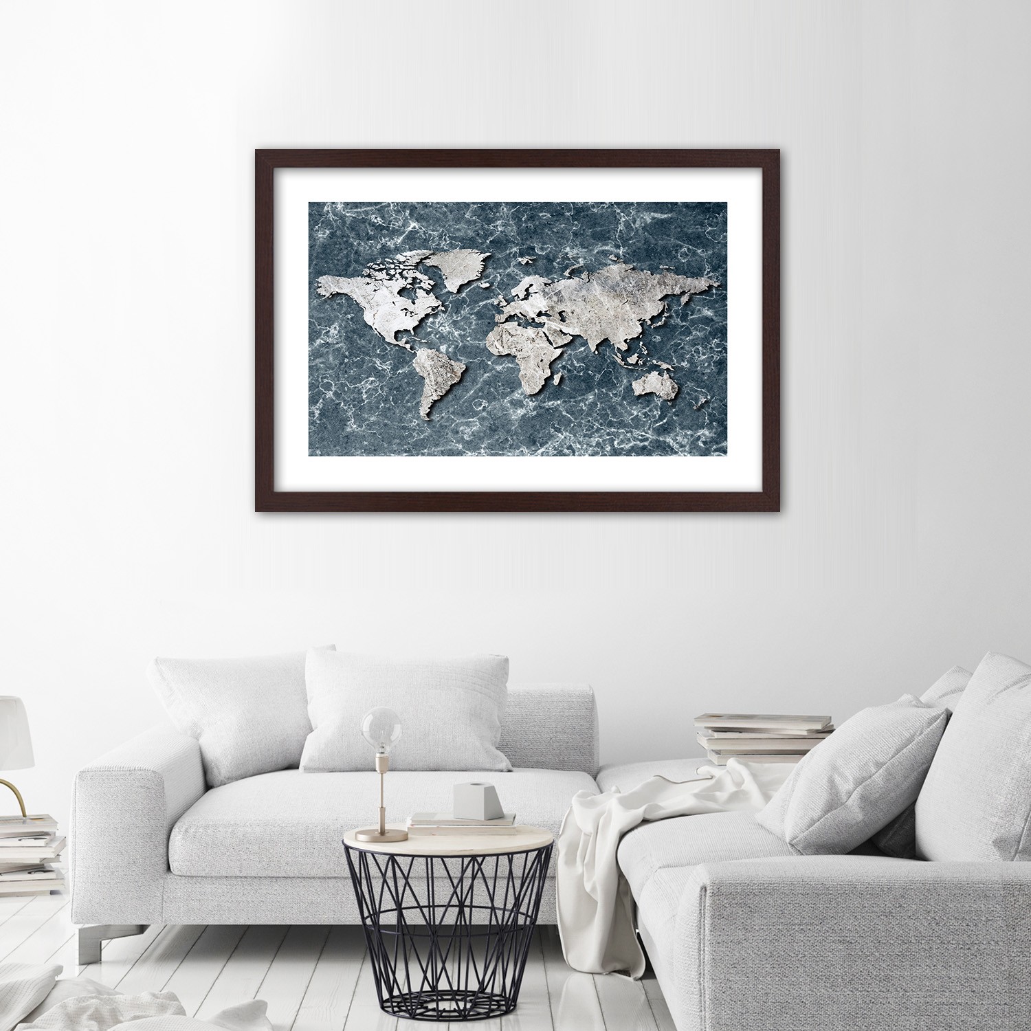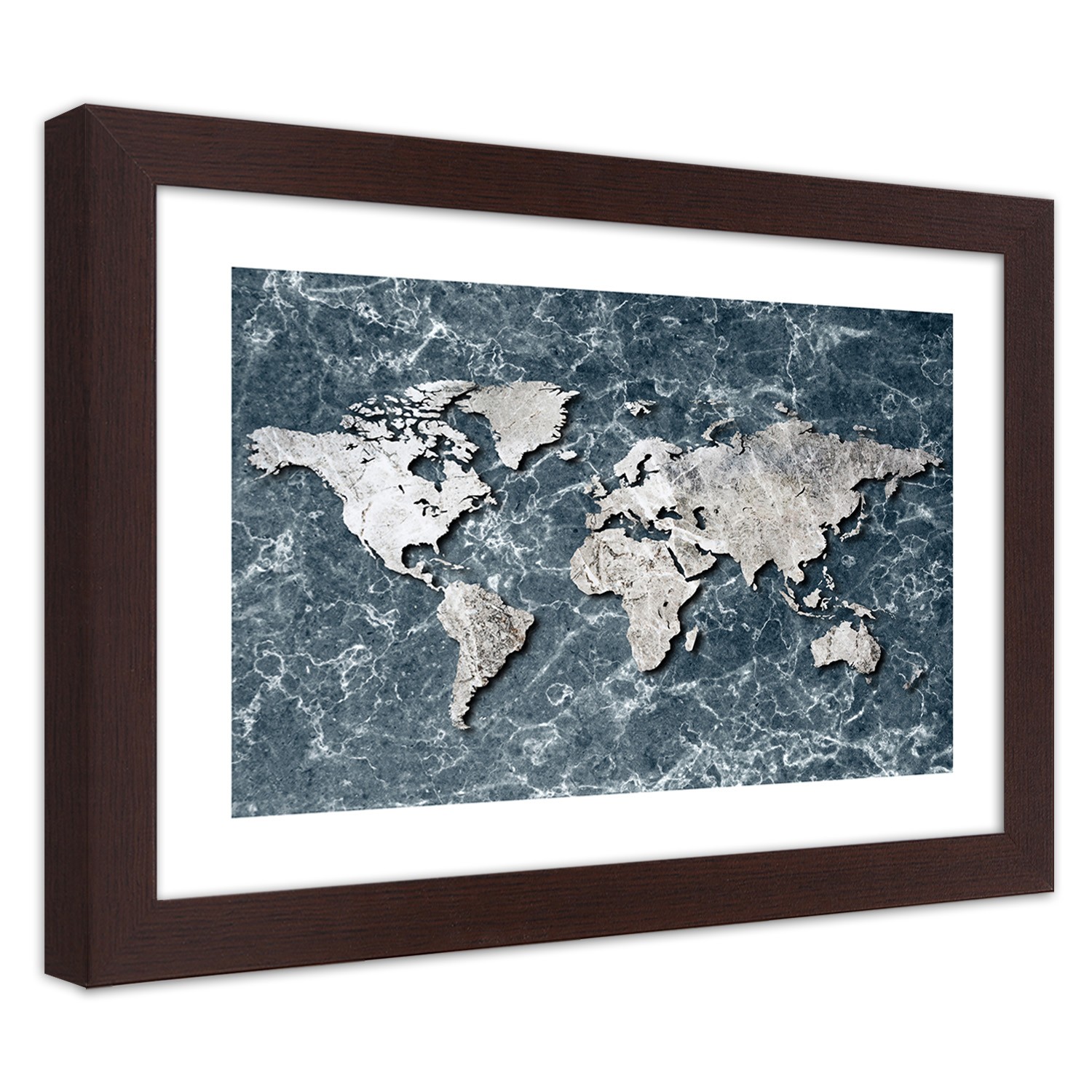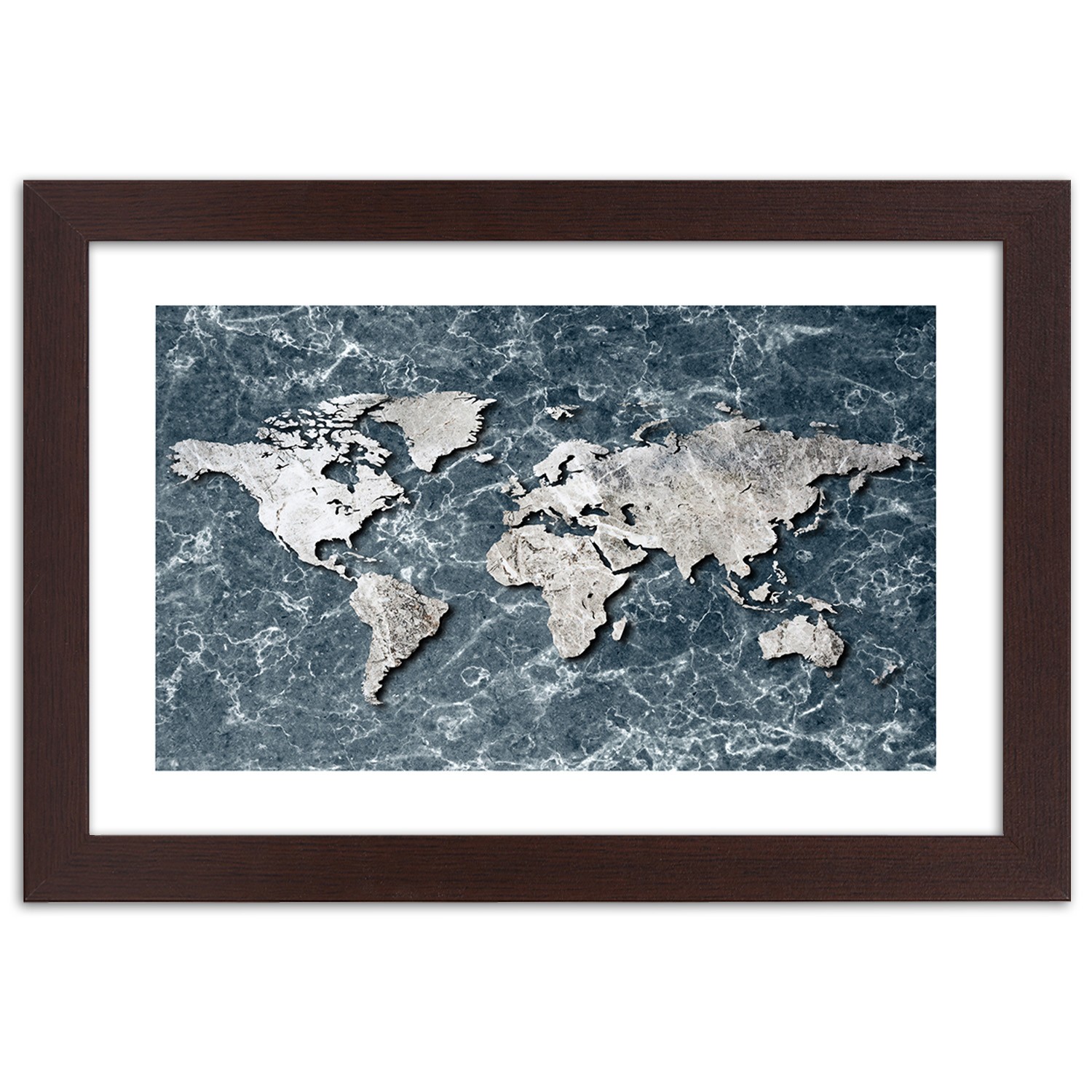 - Frame “Wereldkaart op imitatie marmeren achtergrond” gedrukt op satijnpapier met MDF-frame (medium density fiber).