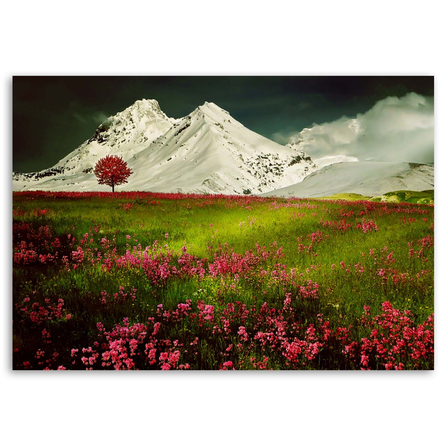 - Afbeelding: “Besneeuwde bergen met kleurrijke weide”.