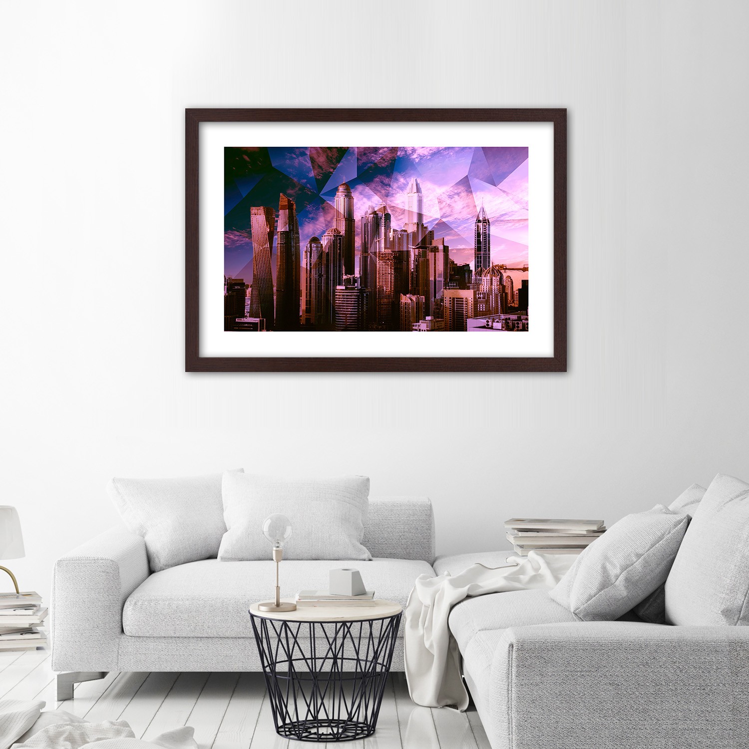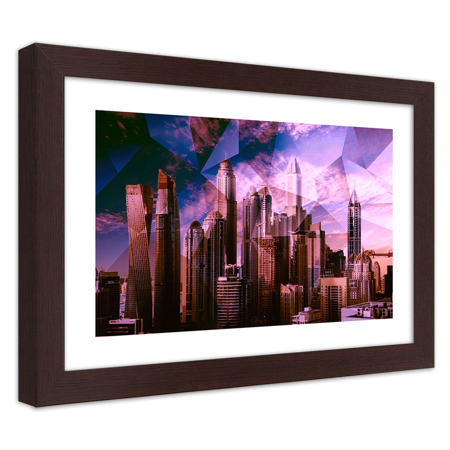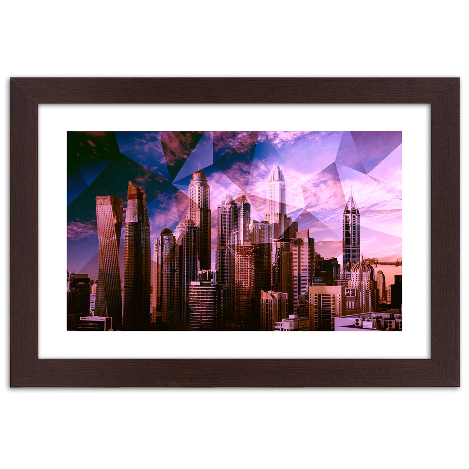 Productinformatie "Mdf-frame met stadsafbeelding gedrukt op papier met paarse kleurafwerking"