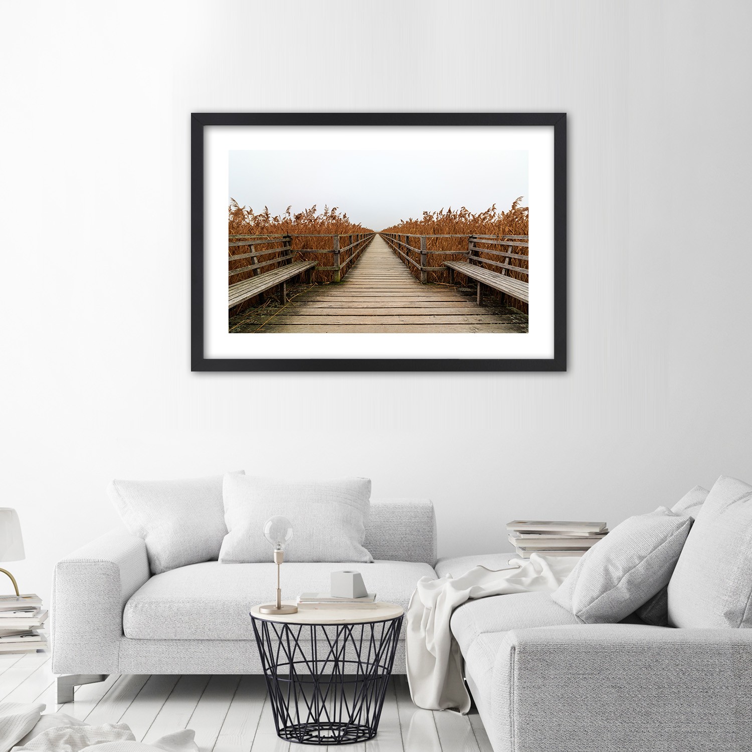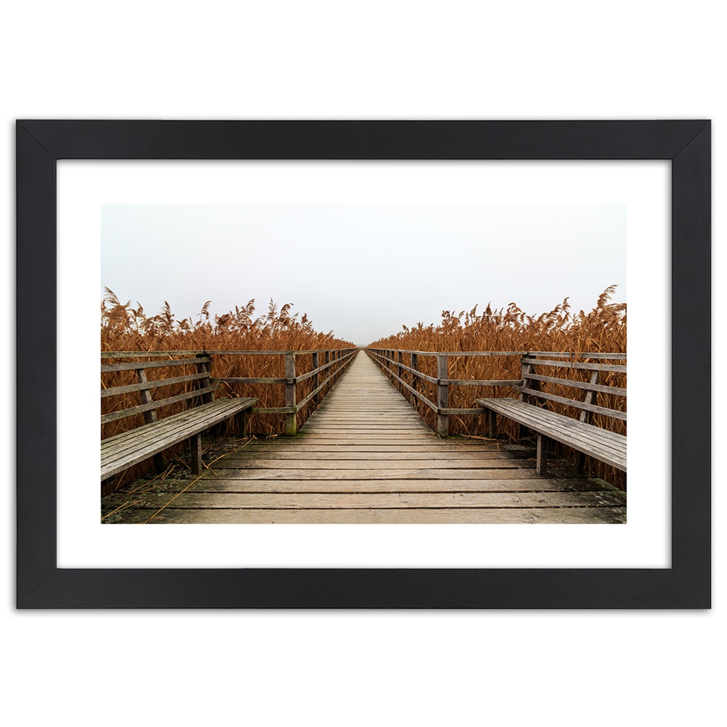 Zwart frame van gefineerd mdf met een poster van de natuur en een ponton op het meer