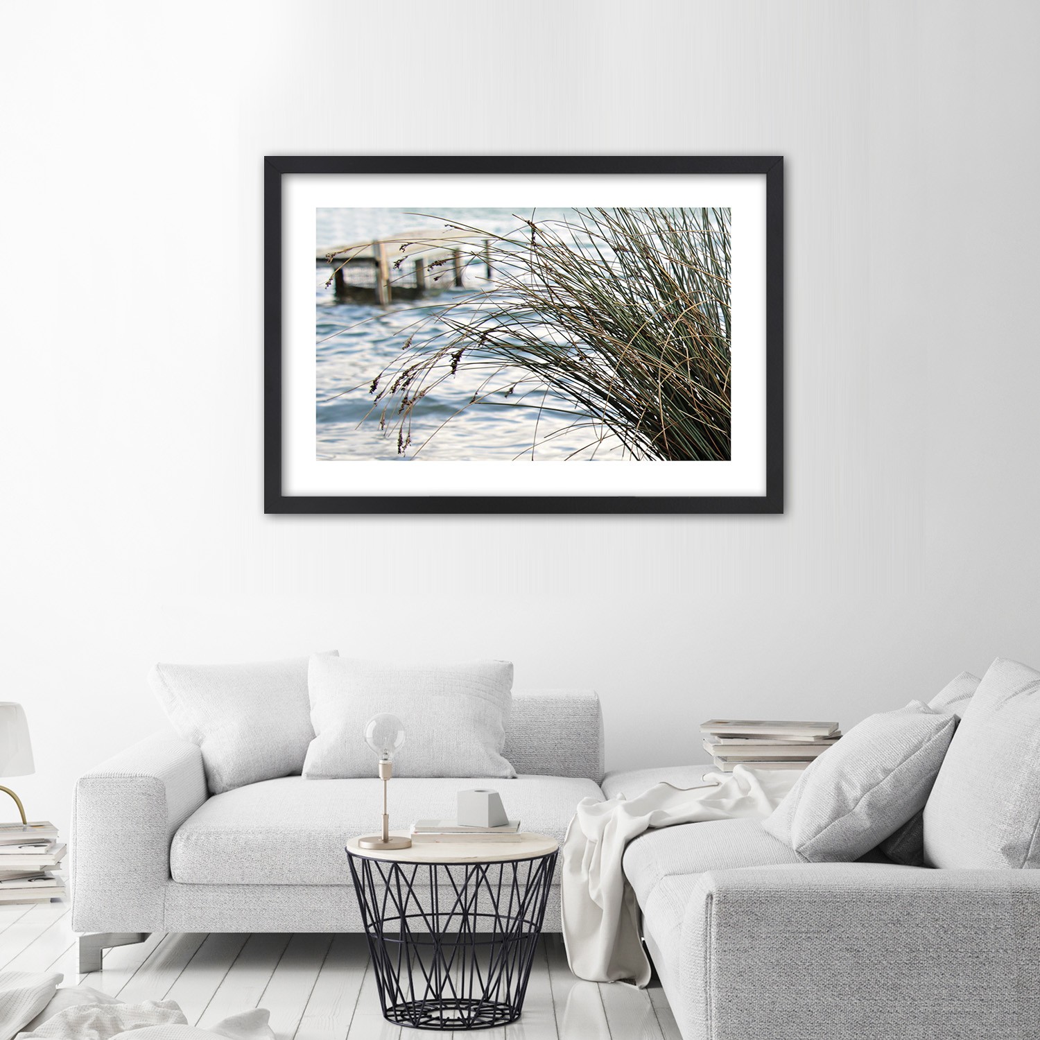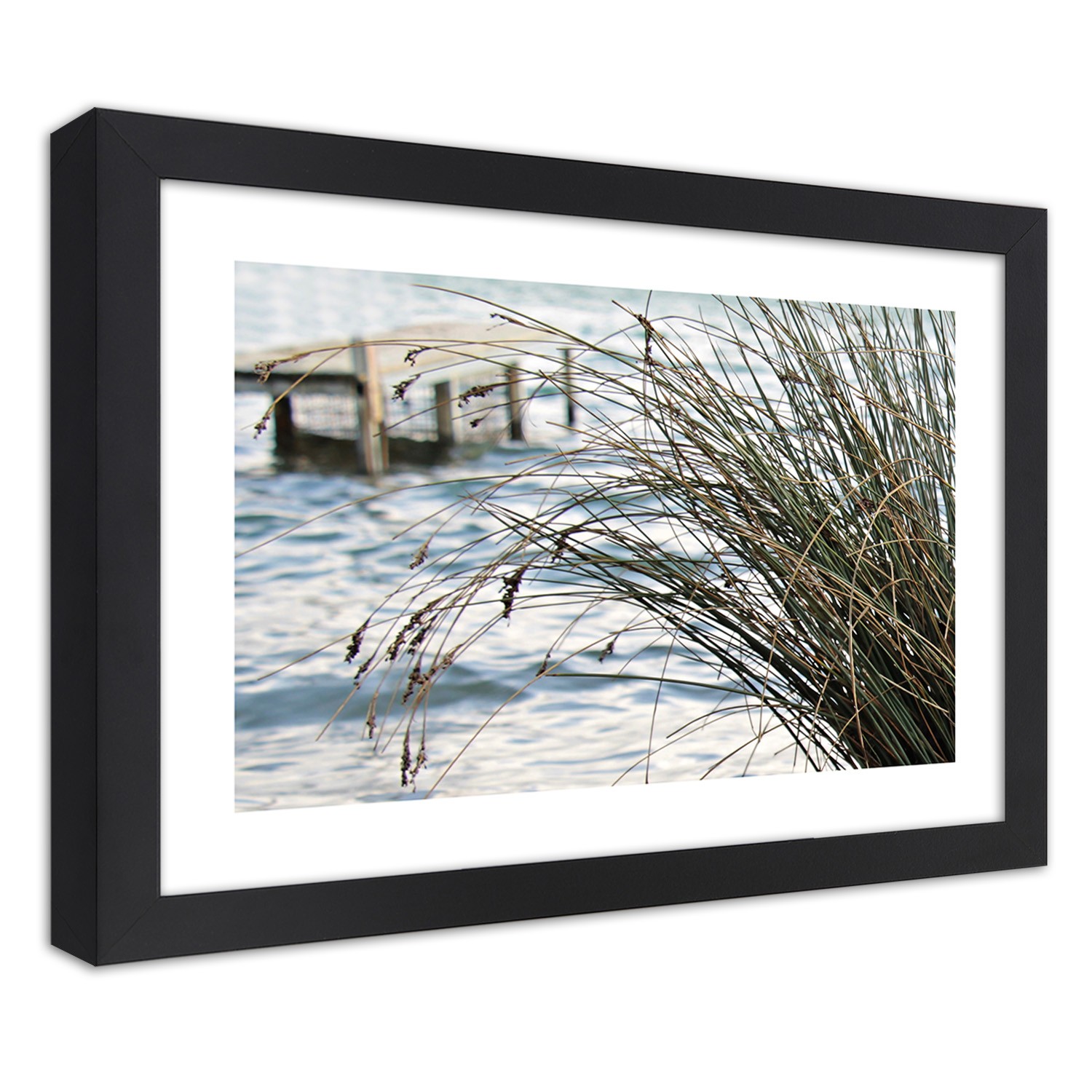 Beschrijving en kenmerken - Zwart gefineerd MDF-frame met decoratief posterponton op zee