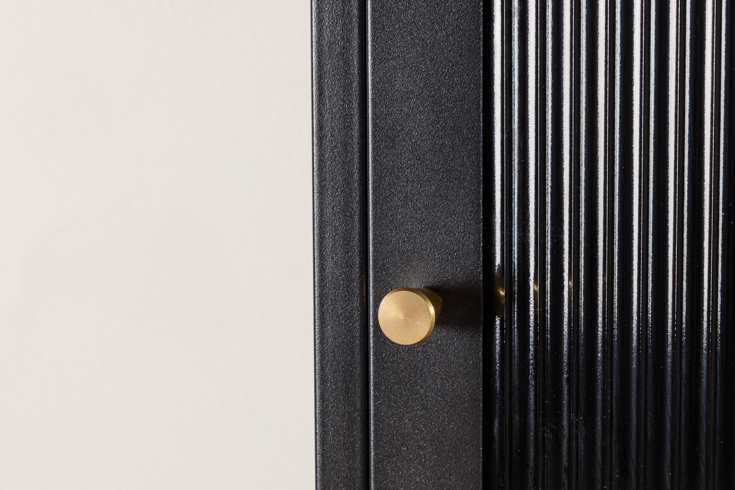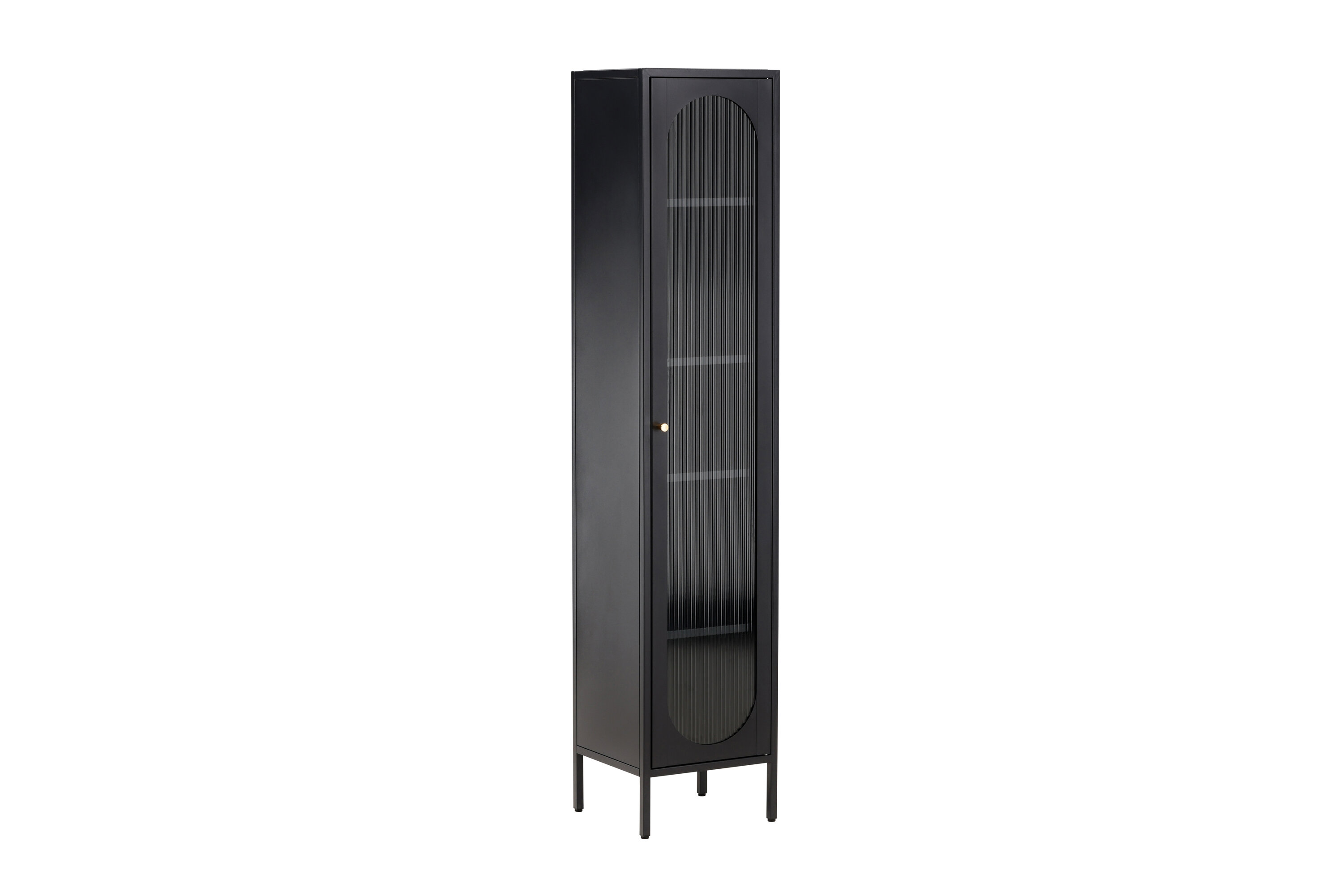 De kast is voorzien van vier ruime planken, waardoor je veel ruimte hebt voor organisatie. De deur van de kast is gemaakt van golvend glas, wat een subtiele textuur en een unieke visuele dimensie aan het stuk toevoegt.