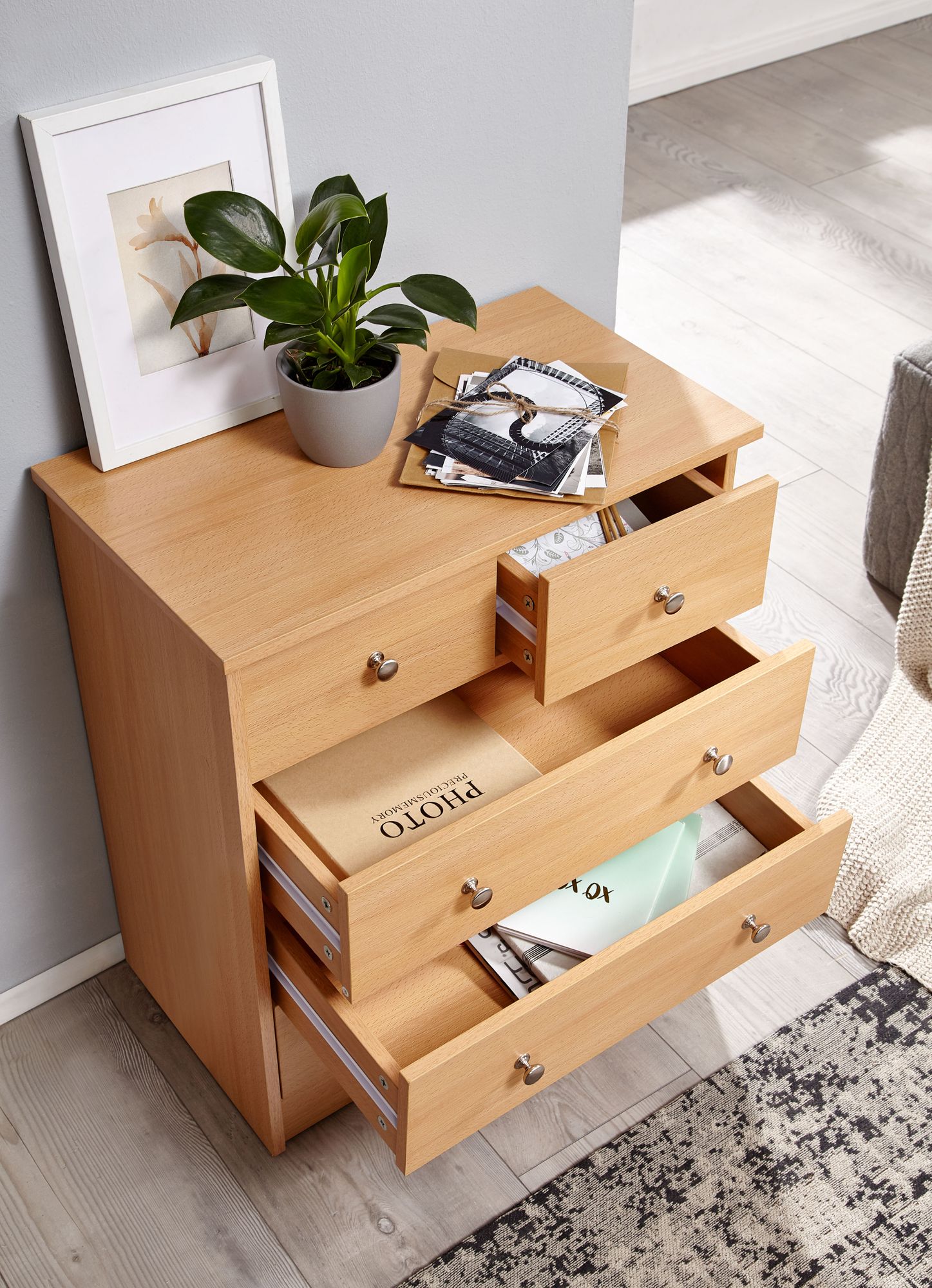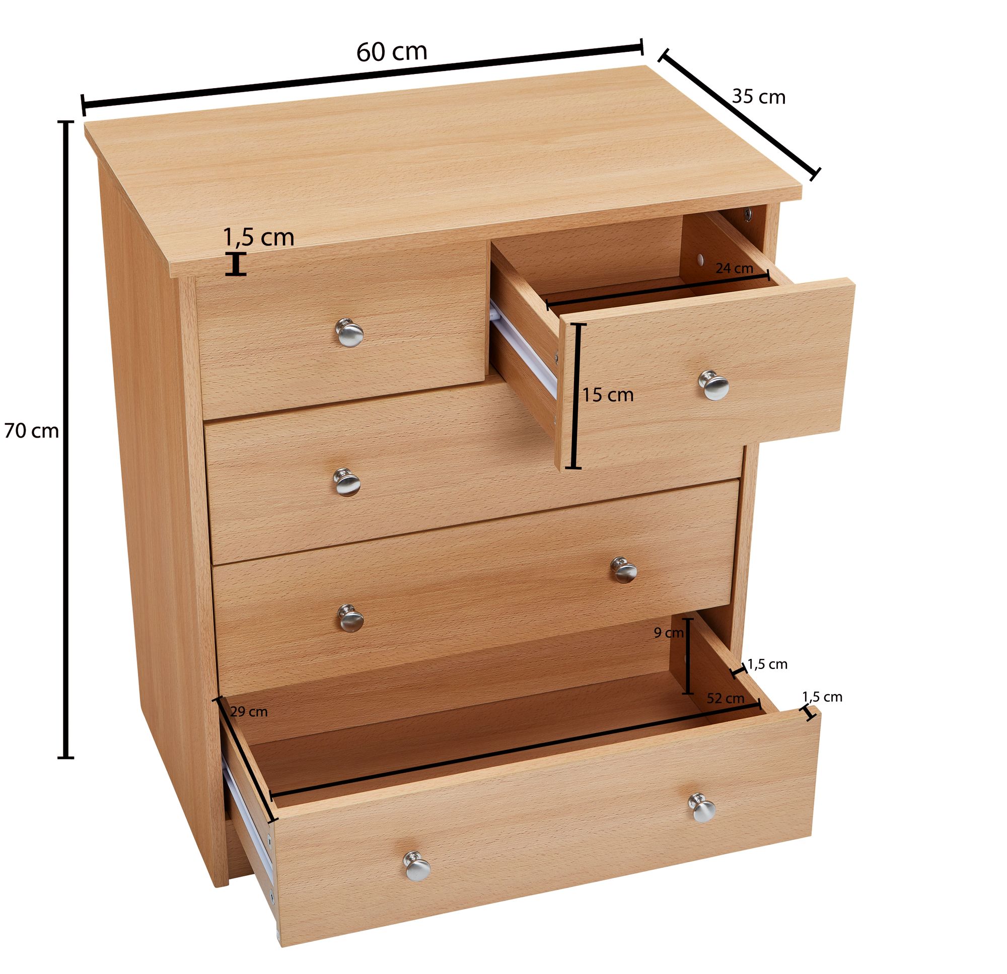 Houten kast beuken licht | 60x70x35 cm | 5 lades zilver metaalkleurig