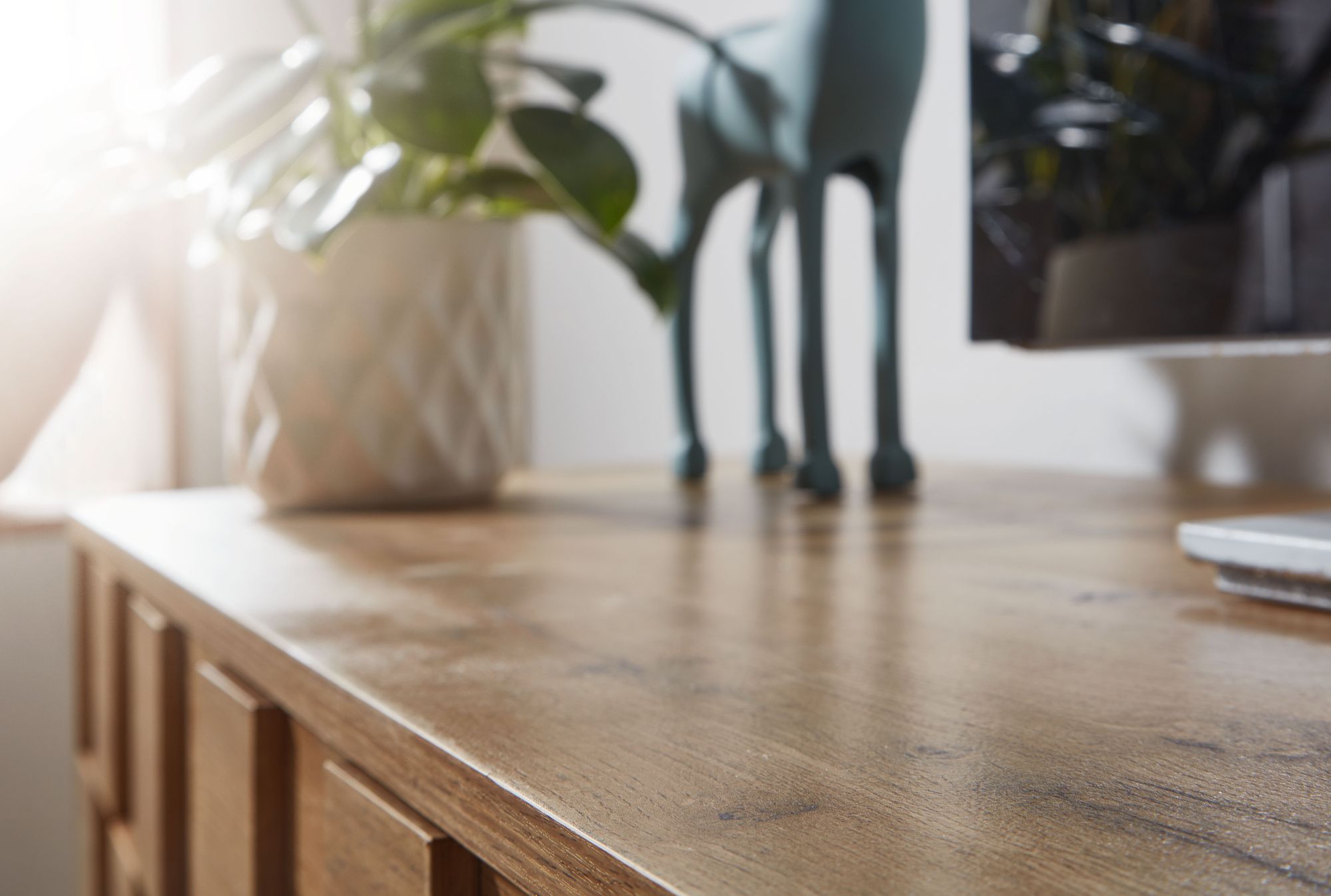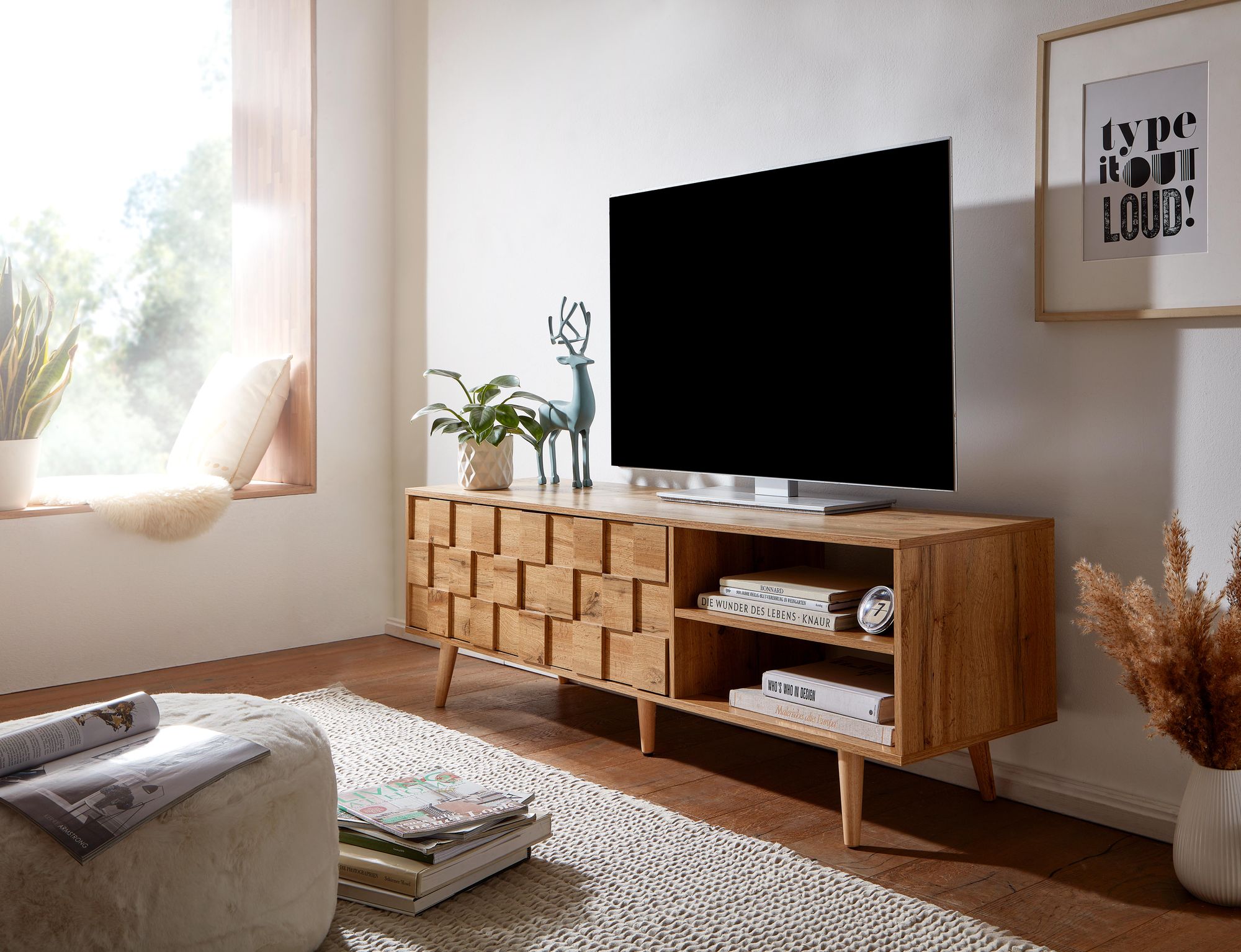 Modern lowboard met eikendecor en een aantrekkelijk tegelpatroon op de deuren. De rechthoekige bovenkant biedt veel ruimte voor tv's tot 70 inch. De deuren hebben een push-to-open functie voor gemakkelijke, greeploze opening. Twee open legplanken voor consoles en twee gesloten vakken voor spellen en dvd's.