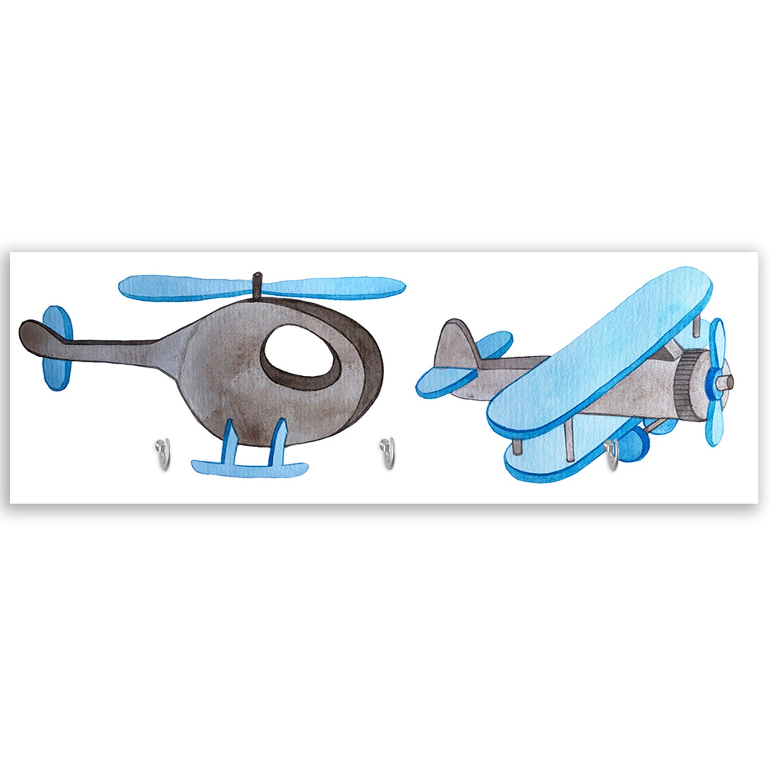 Kapstok in hdf-paneel en satijnpapier met vliegtuig- en helikoptertekening voor kinderen
