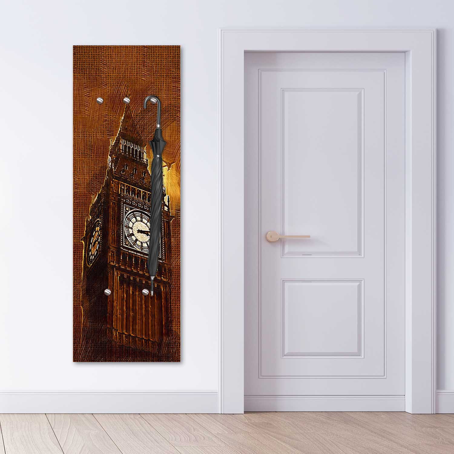 Productinformatie "Kapstok van hardboard en satijnpapier met big ben-design"