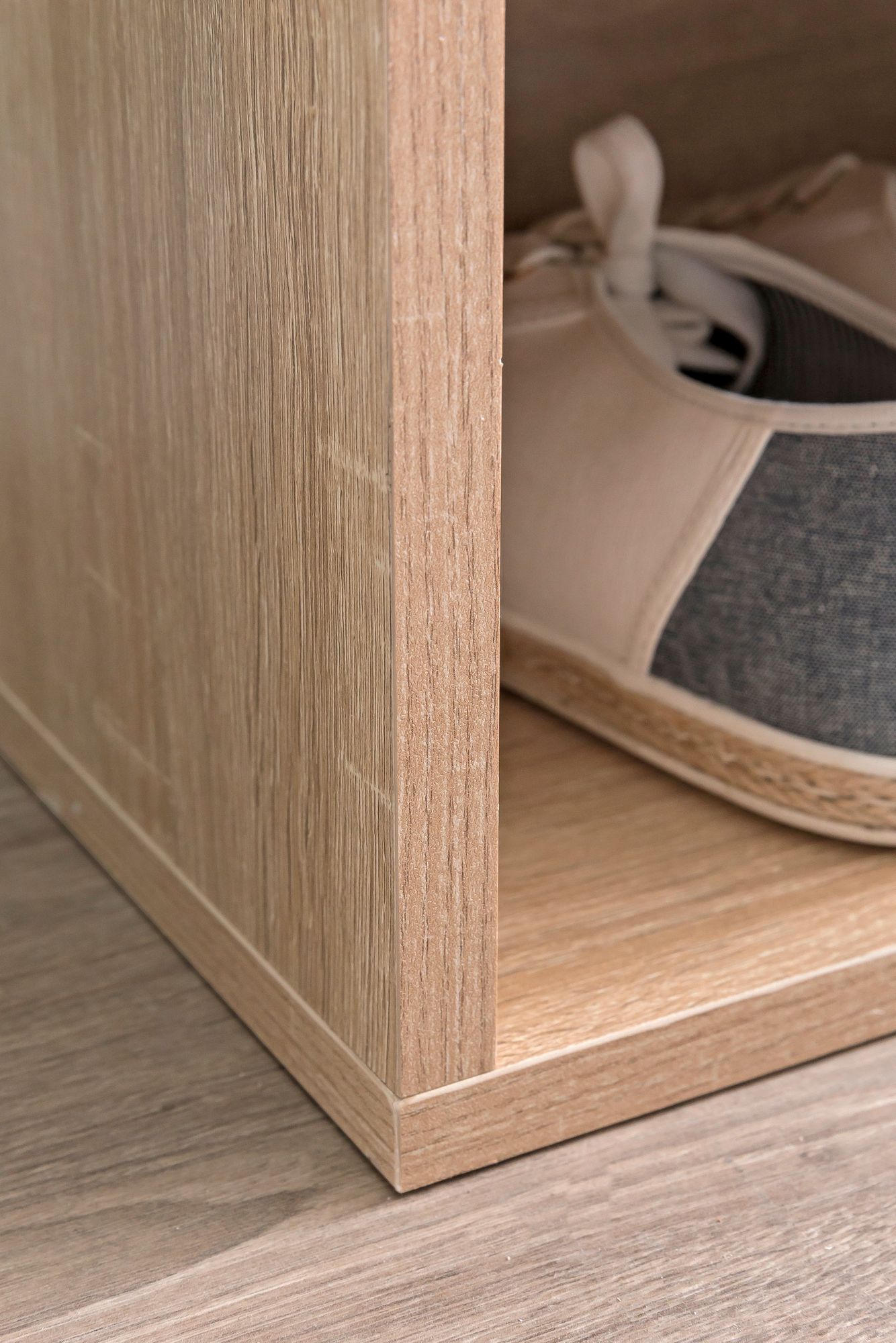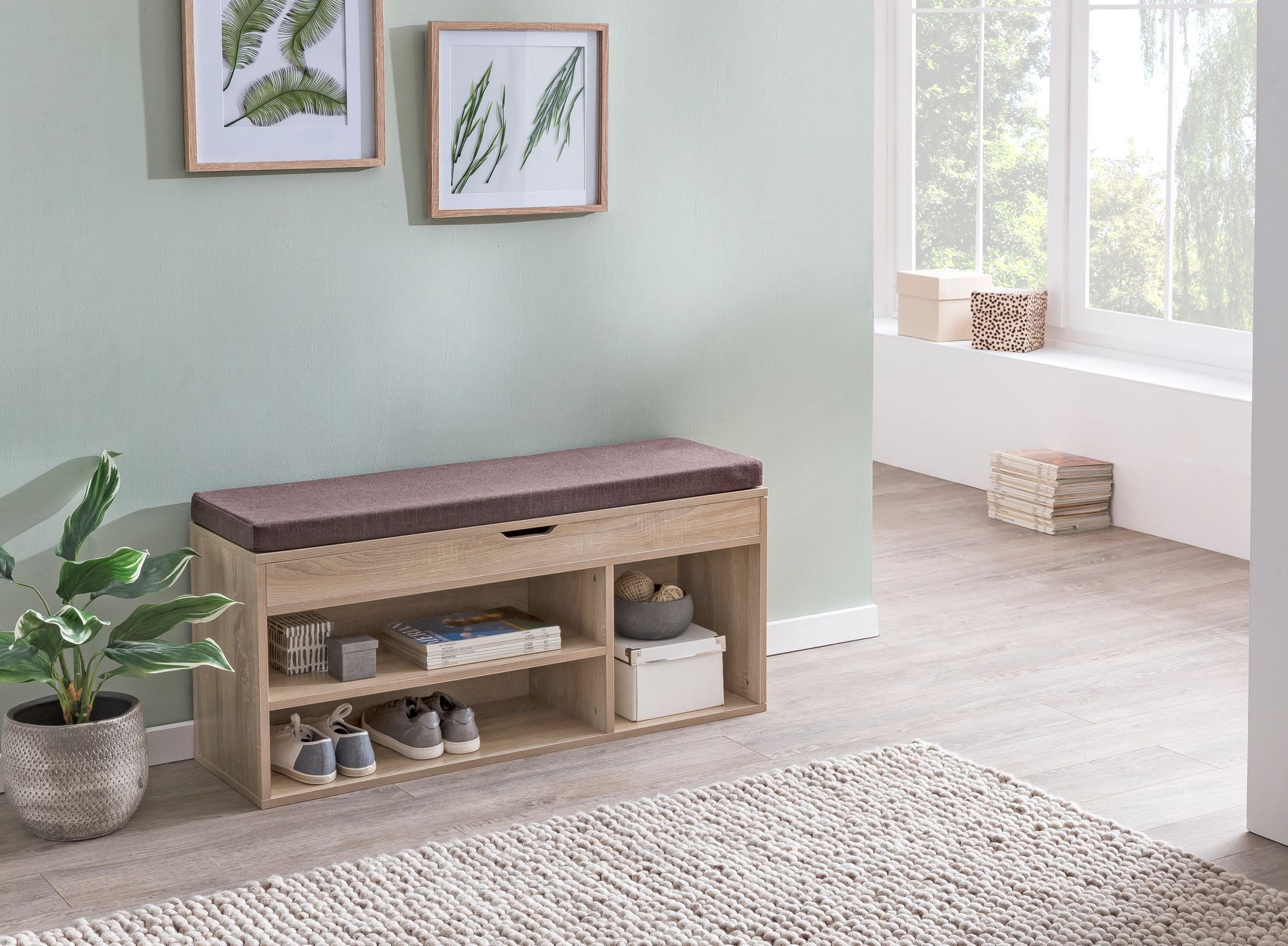 Deze Sonoma opbergbank combineert een modern design met praktische functionaliteit. Het frame is gemaakt van melamine gecoat spaanplaat met een lichte Sonoma houtdecoratie en beschikt over een bruin gestoffeerde zitting met ca. 5 cm vulling voor optimaal zitcomfort. Twee niveaus bieden veel opslagruimte voor schoenen en halbenodigdheden.