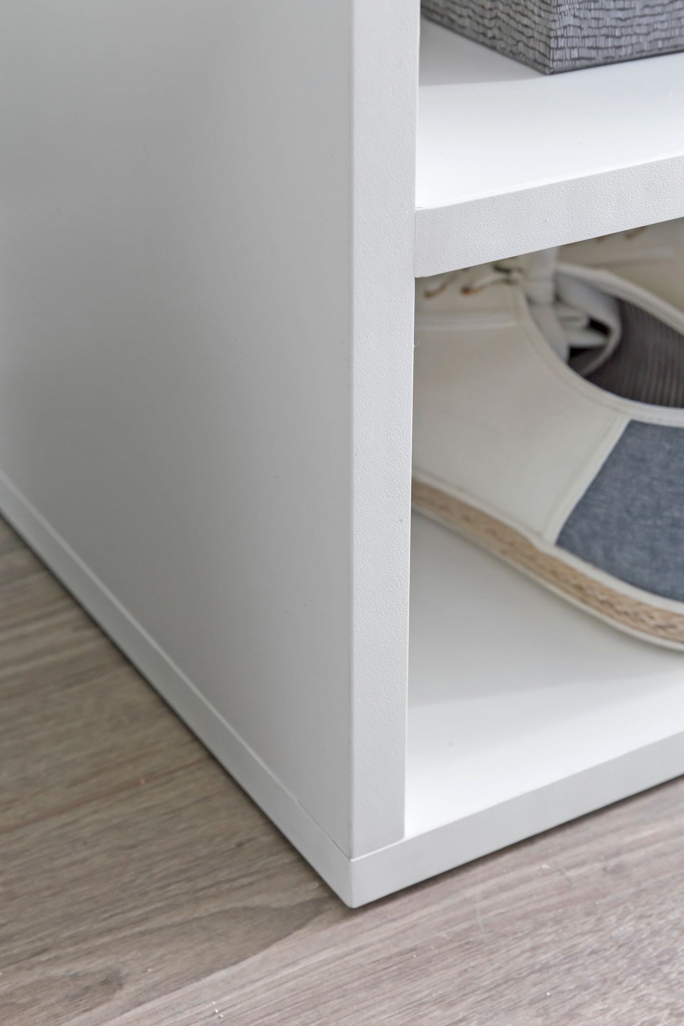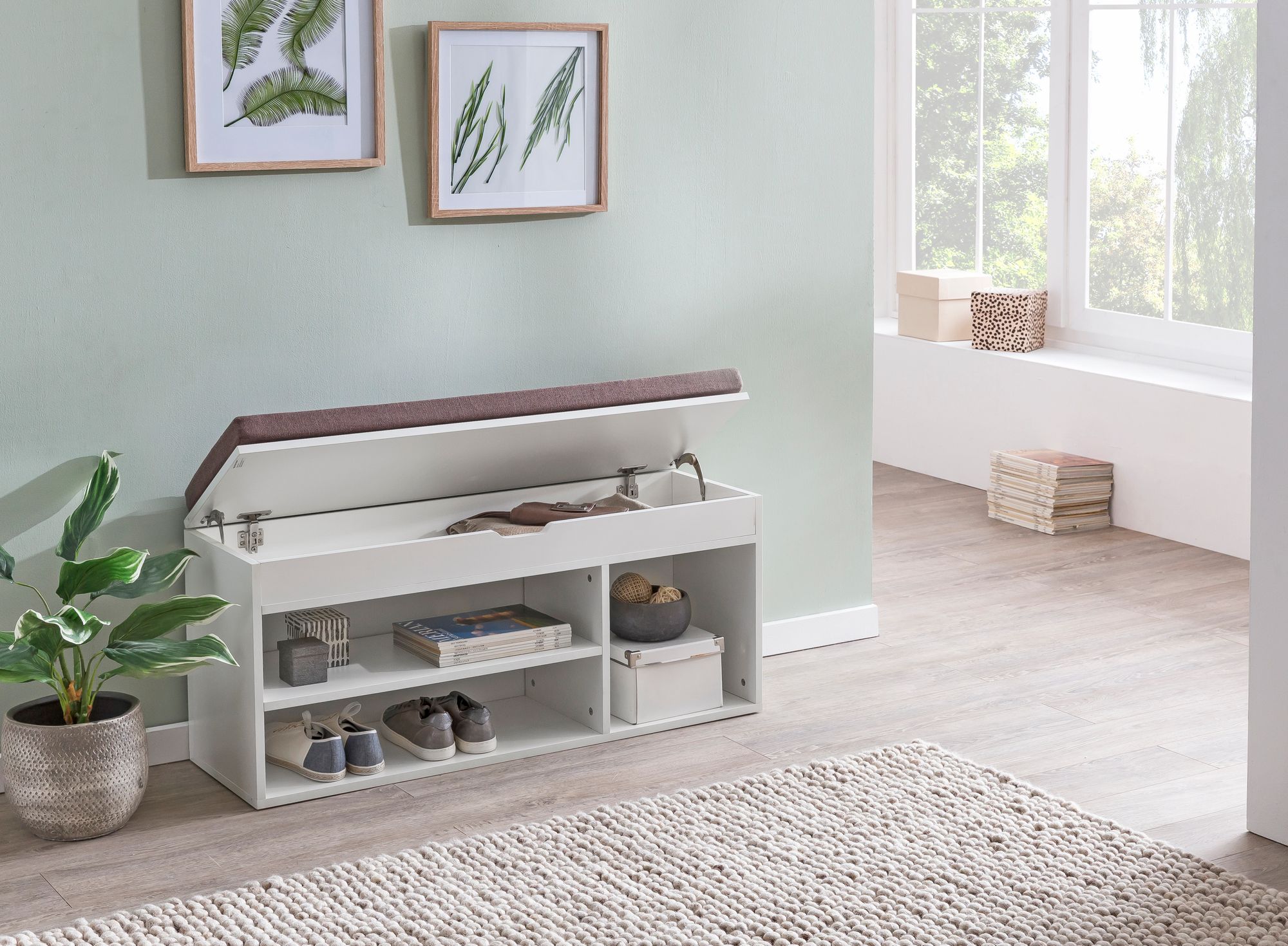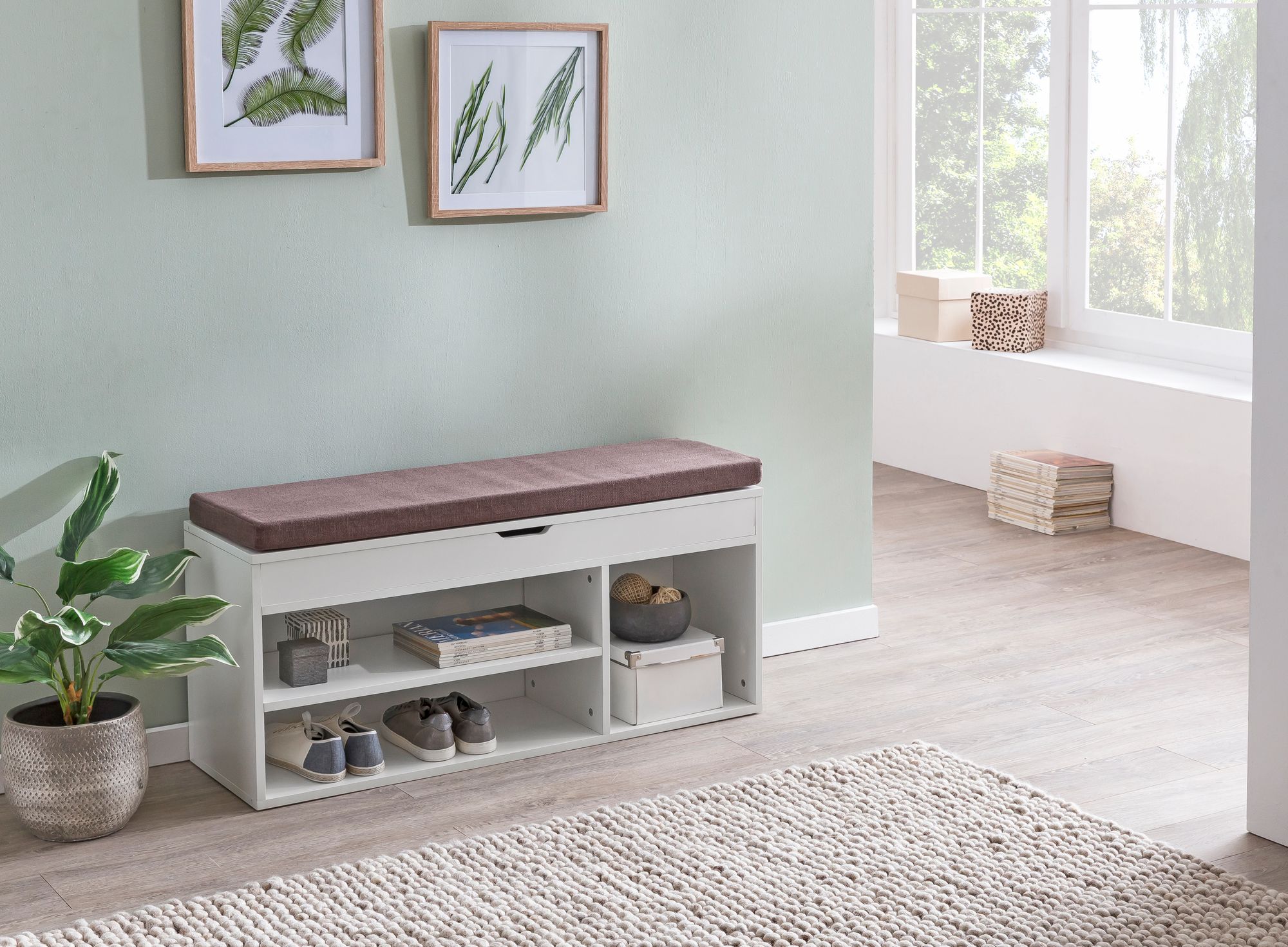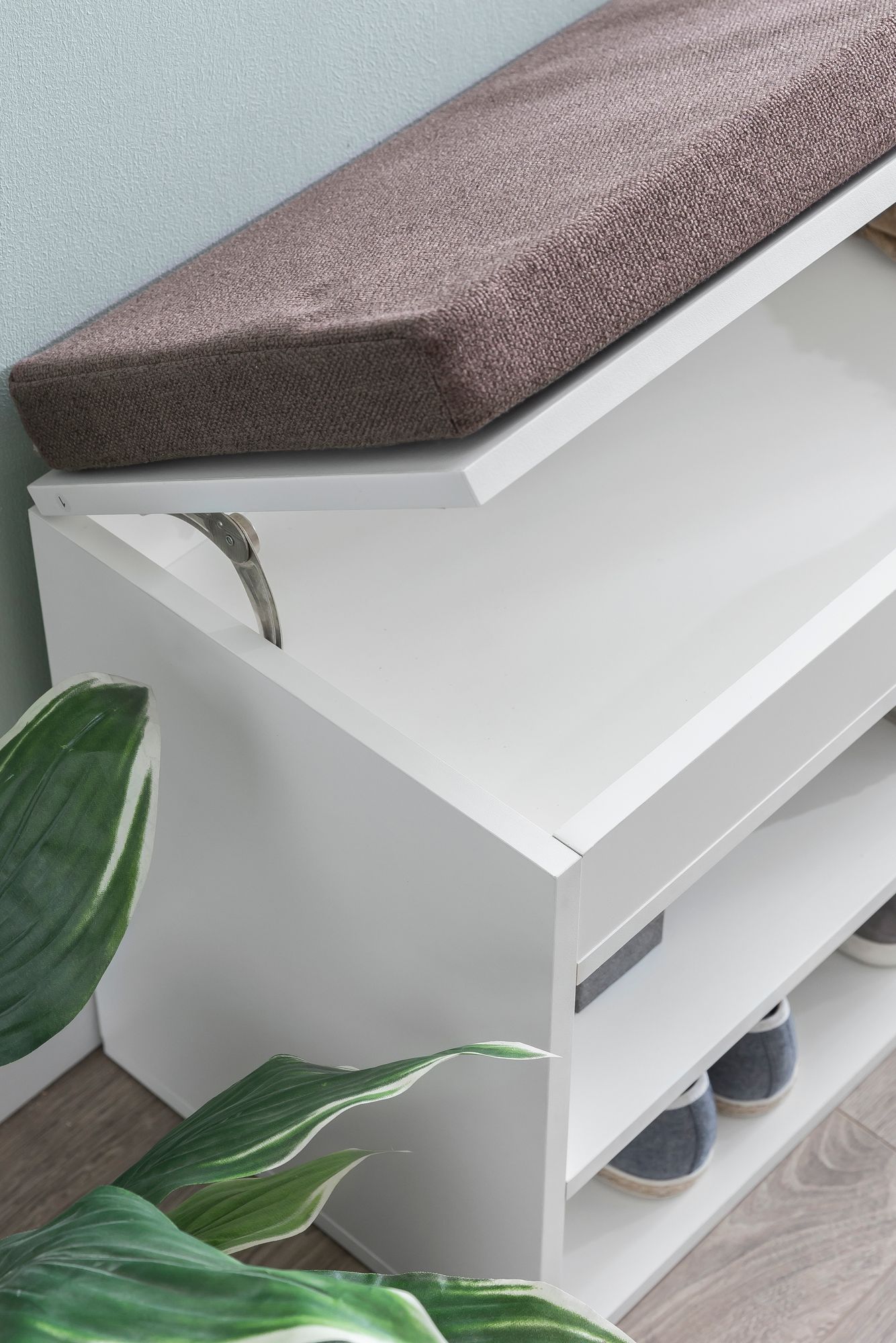 Deze witte opbergbank van melamine heeft een modern design met een zacht bruin stoffen kussen voor comfort. Ideaal voor hal en entree biedt zij twee niveaus opbergruimte voor schoenen en accessoires. Gemaakt van duurzaam melamine gecoat materiaal combineert hij stijl met functie.