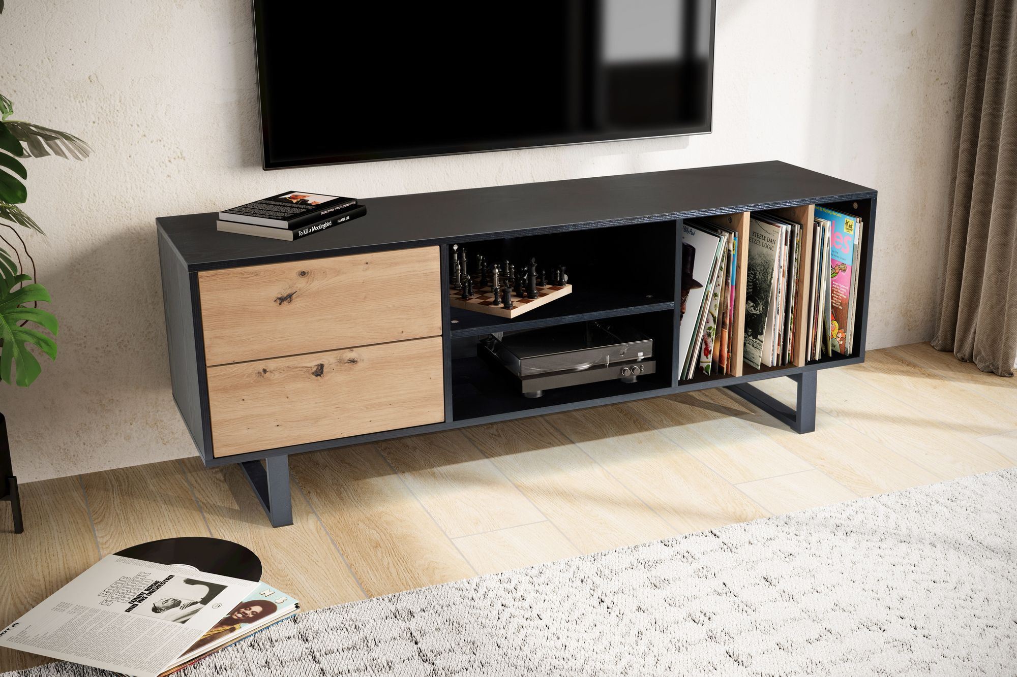 Dit lowboard combineert een modern ontwerp met een elegante zwarte afwerking en eiken fronten, perfect voor eigentijdse interieurs. Het ruime bovenblad (150x55x40 cm) biedt plaats aan televisies tot 70 inch.