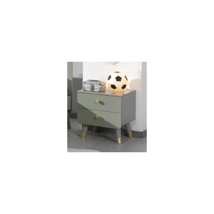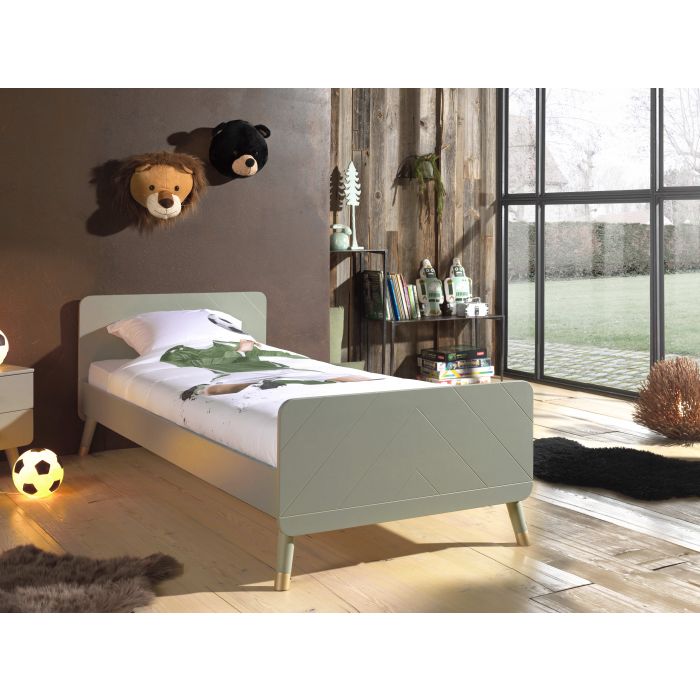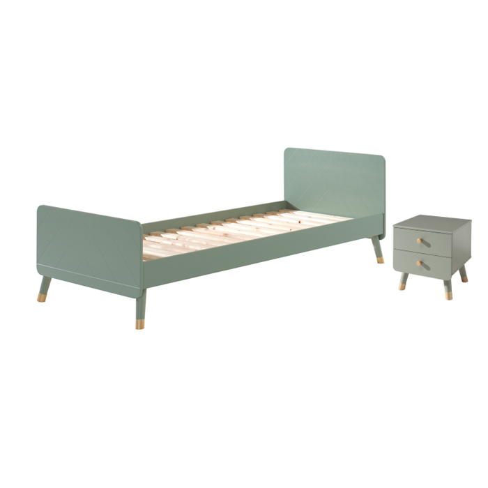 Dit eenpersoonsbed van BILLY is gemaakt uit hoogwaardig MDF en is gelakt in de trendkleur olijfgroen. Het bed is aan het hoofd- en voetbord versierd met een grafisch patroon, wat dit bed een unieke uitstraling geeft. De goudkleurige pootjes benadrukken het retro karakter. Het BILLY-nachtkastje is de perfecte finishing touch voor elke slaapkamer! Deze combinatie zal perfect passen in een romantisch of modern interieur.