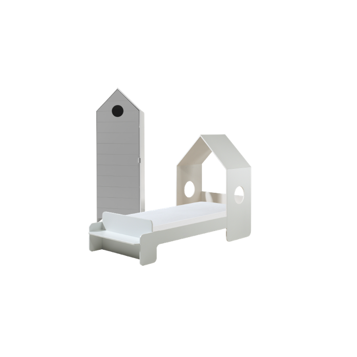 Het CASAMI bed is vervaardigd uit wit gelakte MDF en heeft een afmeting van 90 x 200 cm. Het dakje zorgt voor een knus gevoel en het bed beschikt ook over een extra zitbankje/boekenplankje. Bij deze combinatie is een CASAMI kast in de vorm van een strandhuisje met grijze deur inbegrepen. Ideaal om te gebruiken als opbergruimte voor kledij, speelgoed, boeken, beddengoed,..