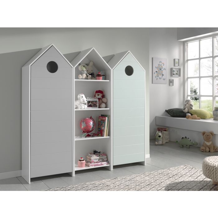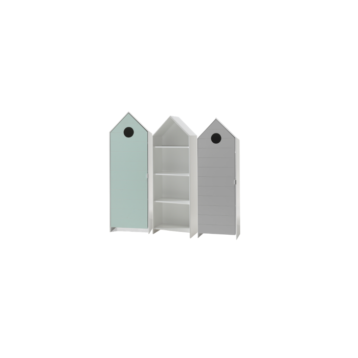 De kastjes uit de CASAMI collectie in de vorm van een strandhuisje geven meteen een speelse en kleurrijke toets aan elke kinderkamer. U kan ze combineren met verschillende artikels uit onze andere collecties. De kastjes met deuren in mintgroen en grijs hebben 3 legplanken en een kledinghanger. De open kast in wit beschikt over 3 legplanken die naar eigen keuze kunnen worden ingedeeld. Er is dus voldoende opbergruimte voorzien voor kledij, speelgoed, boeken, beddengoed,...