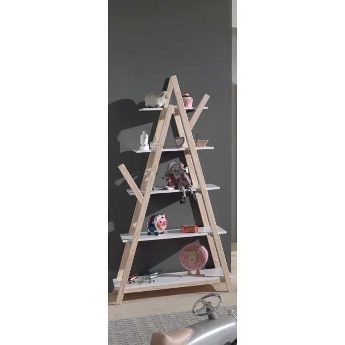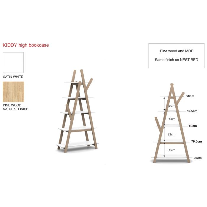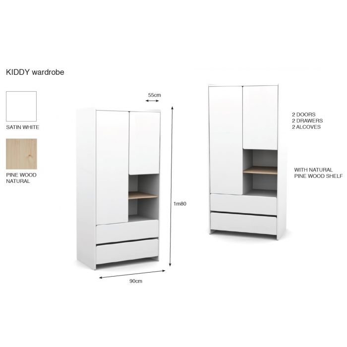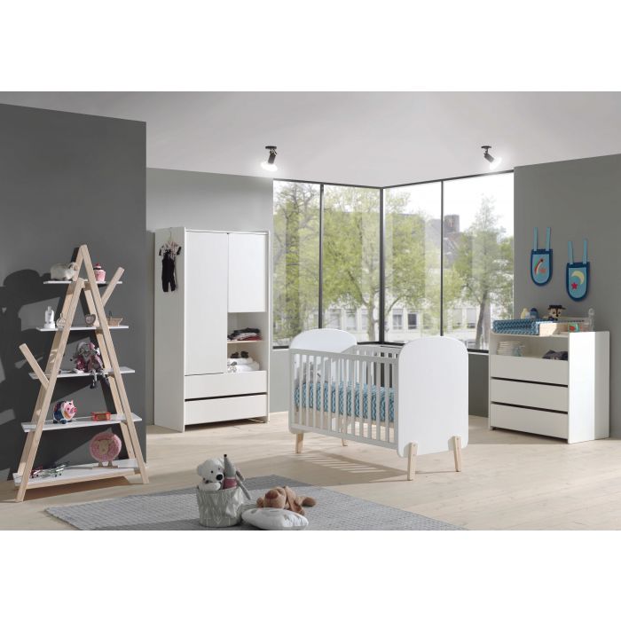Het KIDDY babybed (60x120) is vervaardigd uit wit gelakte MDF en heeft een warme uitstraling door het afgeronde hoofd- en voeteinde, de mooie witte kleur en de 4 pootjes in massief hout. De lattenbodem is verstelbaar in 3 hoogtes. De kommode is alsook vervaardigd uit wit gelakte MDF en past met zijn strak en eenvoudig design in elk interieur. De 3 laden en het open vak bieden voldoende opbergruimte. Er is een opzetstuk in massief grenen voorzien dat kan dienen als luierplank. Dit is de ideale meerwaarde voor elke babykamer. De kleerkast is alsook vervaardigd uit wit gelakte MDF met een legplank in massieve den en beschikt over 2 deuren en 2 lades. De combinatie van de afgeronde hoeken en de asymmetrische deuren geven de kast een speels uiterlijk. De boekenkast in de vorm van een tipi heeft een Scandinavische stijl door de combinatie van strakke witte plankjes in gelakte MDF en de natuurkleurige afwerking in massieve den.