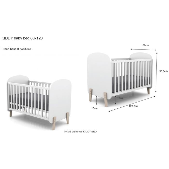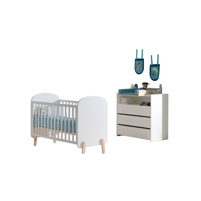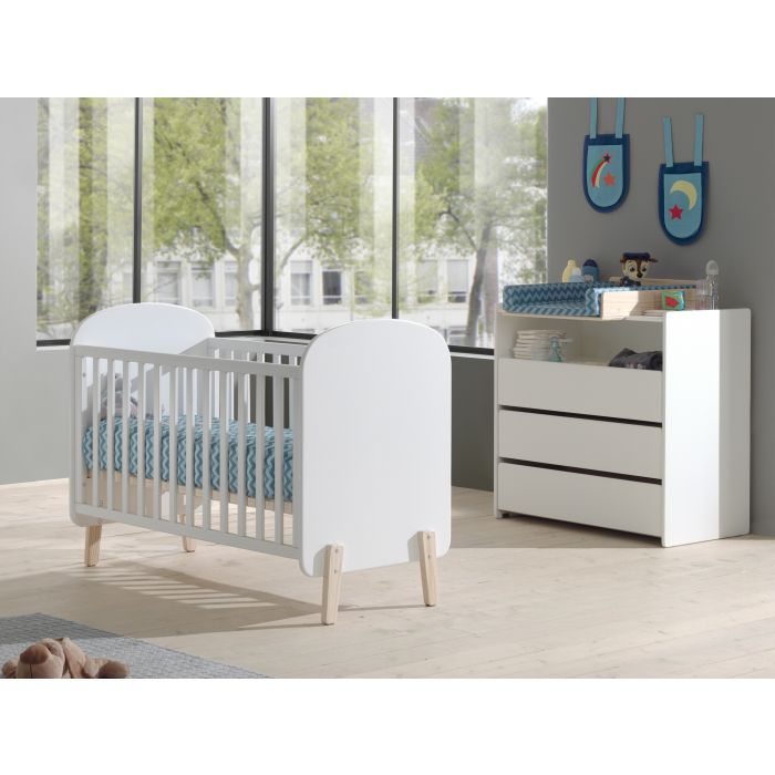 Het KIDDY babybed (60x120) is vervaardigd uit wit gelakte MDF en heeft een warme uitstraling door het afgeronde hoofd- en voeteinde, de mooie witte kleur en de 4 pootjes in massief hout. De lattenbodem is verstelbaar in 3 hoogtes. De kommode is alsook vervaardigd uit wit gelakte MDF en past met zijn strak en eenvoudig design in elk interieur. De 3 laden en het open vak bieden voldoende opbergruimte. Er is een opzetstuk in massief grenen voorzien dat kan dienen als luierplank. Dit is de ideale meerwaarde voor elke babykamer.