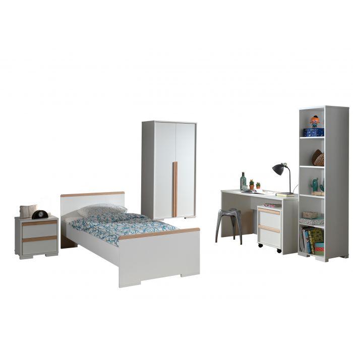 Het LONDON bed (90x200) in wit heeft een Scandinavisch karakter door de combinatie met massief grenen. Het bed werd afgewerkt in witte melamine wat zeer stevig en krasvrij is. Het nachtkastje beschikt over 2 uiterst handige lades die elk beschikken over een soft-close systeem. De 2-deurs kleerkast beschikt over 2 legplanken en heeft ook een hangreel over de gehele breedte van 2 deuren. Het bureau heeft een ruim schrijfoppervlak en er is extra veel opbergruimte voorzien in de bijpassende rolcontainer. De boekenkast is onderverdeeld in 5 vakken door middel van 4 legplanken en is ideaal voor het opbergen van schoolmateriaal en boeken of het uitstallen van persoonlijke spullen. De smaakvolle accenten geven deze collectie meteen een stijlvol uiterlijk.