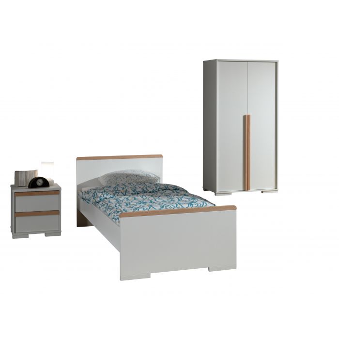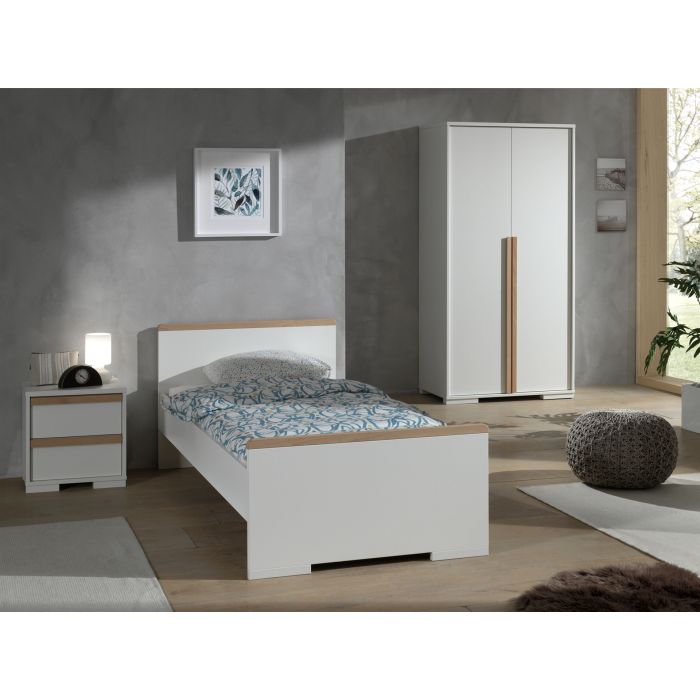 Het LONDON bed (90x200) in wit heeft een Scandinavisch karakter door de combinatie met massief grenen. Het bed werd afgewerkt in witte melamine wat zeer stevig en krasvrij is. Het nachtkastje beschikt over 2 uiterst handige lades die elk beschikken over een soft-close systeem. De 2-deurs kleerkast beschikt over 2 legplanken en heeft ook een hangreel over de gehele breedte van 2 deurenDe smaakvolle accenten geven deze collectie meteen een stijlvol uiterlijk.