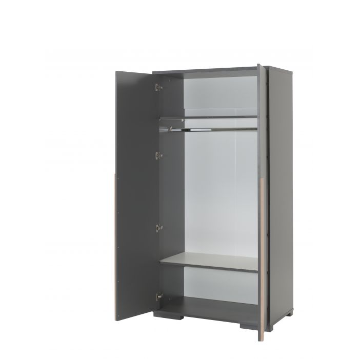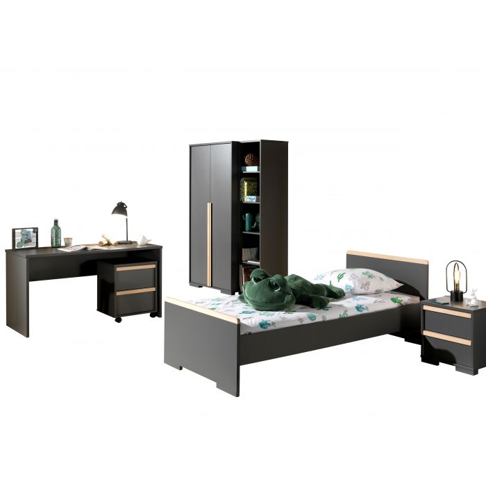 Het LONDON bed (90x200) in antraciet heeft een Scandinavisch karakter door de combinatie met massief grenen. Het bed werd afgewerkt in witte melamine wat zeer stevig en krasvrij is. Het nachtkastje beschikt over 2 uiterst handige lades die elk beschikken over een soft-close systeem. De 2-deurs kleerkast beschikt over 2 legplanken en heeft ook een hangreel over de gehele breedte van 2 deuren. Het bureau heeft een ruim schrijfoppervlak en er is extra veel opbergruimte voorzien in de bijpassende rolcontainer. De boekenkast is onderverdeeld in 5 vakken door middel van 4 legplanken en is ideaal voor het opbergen van schoolmateriaal en boeken of het uitstallen van persoonlijke spulletjes. De smaakvolle accenten geven deze collectie meteen een stijlvol uiterlijk.