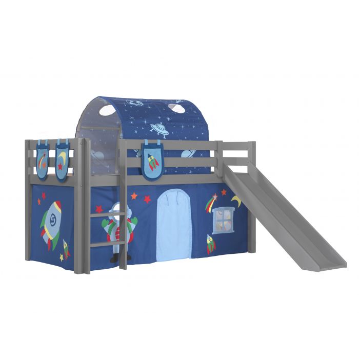 Deze PINO hoogslaper is vervaardigd van massief grenen en is grijs gelakt. Kinderen zijn dol op de glijbaan en ladder die zowel links als rechts gemonteerd kunnen worden. De lattenbodem is inbegrepen. De allround valbeveiliging, brede treden en goede stabiliteit maken dit bed heel veilig. De ruimte onder het bed kan gebruikt worden om te spelen of als opbergruimte. In het PINO gamma zijn verschillende mogelijkheden beschikbaar om dit bed aan te vullen met een bureau, bibliotheek, commodes, hangplankje of leuke textielset. Bij deze combinatie zijn een speelgordijn Astro, 3 zakjes Astro en een tunnel Astro inbegrepen.