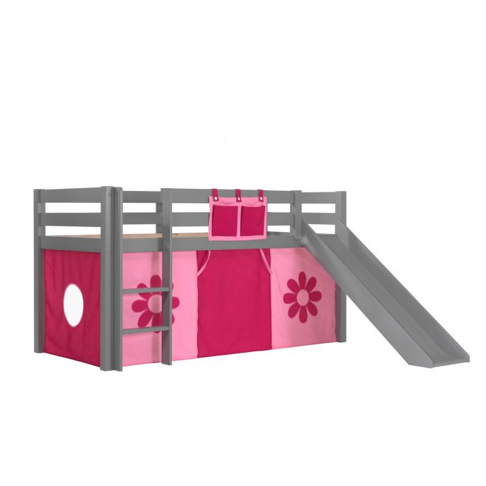 Deze PINO hoogslaper is vervaardigd van massief grenen en is grijs gelakt. Kinderen zijn dol op de glijbaan en ladder die zowel links als rechts gemonteerd kunnen worden. De lattenbodem is inbegrepen. De allround valbeveiliging, brede treden en goede stabiliteit maken dit bed heel veilig. De ruimte onder het bed kan gebruikt worden om te spelen of als opbergruimte. In het PINO gamma zijn verschillende mogelijkheden beschikbaar om dit bed aan te vullen met een bureau, bibliotheek, commodes, hangplankje of leuke textielset. Bij deze combinatie is een speelgordijn Pink Flower inbegrepen.