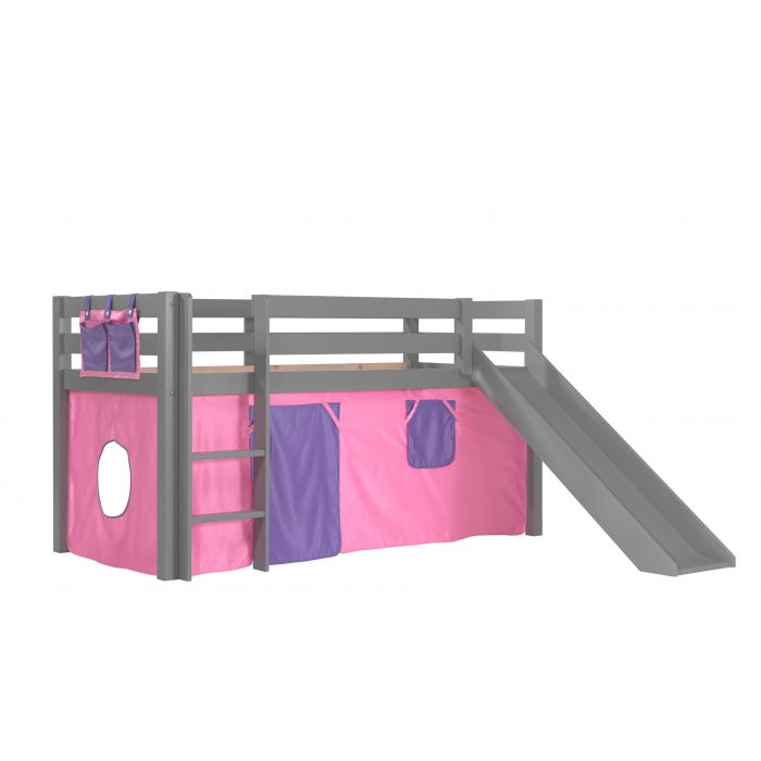 Deze PINO hoogslaper is vervaardigd van massief grenen en is grijs gelakt. Kinderen zijn dol op de glijbaan en ladder die zowel links als rechts gemonteerd kunnen worden. De lattenbodem is inbegrepen. De allround valbeveiliging, brede treden en goede stabiliteit maken dit bed heel veilig. De ruimte onder het bed kan gebruikt worden om te spelen of als opbergruimte. In het PINO gamma zijn verschillende mogelijkheden beschikbaar om dit bed aan te vullen met een bureau, bibliotheek, commodes, hangplankje of leuke textielset. Bij deze combinatie is een speelgordijn Bella inbegrepen.