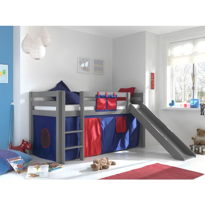 Deze PINO hoogslaper is vervaardigd van massief grenen en is grijs gelakt. Kinderen zijn dol op de glijbaan en ladder die zowel links als rechts gemonteerd kunnen worden. De lattenbodem is inbegrepen. De allround valbeveiliging, brede treden en goede stabiliteit maken dit bed heel veilig. De ruimte onder het bed kan gebruikt worden om te spelen of als opbergruimte. In het PINO gamma zijn verschillende mogelijkheden beschikbaar om dit bed aan te vullen met een bureau, bibliotheek, commodes, hangplankje of leuke textielset. Bij deze combinatie is een speelgordijn Domino inbegrepen.