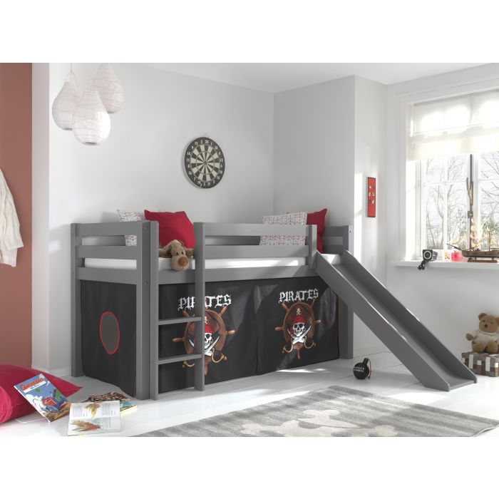 Deze PINO hoogslaper is vervaardigd van massief grenen en is grijs gelakt. Kinderen zijn dol op de glijbaan en ladder die zowel links als rechts gemonteerd kunnen worden. De lattenbodem is inbegrepen. De allround valbeveiliging, brede treden en goede stabiliteit maken dit bed heel veilig. De ruimte onder het bed kan gebruikt worden om te spelen of als opbergruimte. In het PINO gamma zijn verschillende mogelijkheden beschikbaar om dit bed aan te vullen met een bureau, bibliotheek, commodes, hangplankje of leuke textielset. Bij deze combinatie is een speelgordijn Pirates inbegrepen.