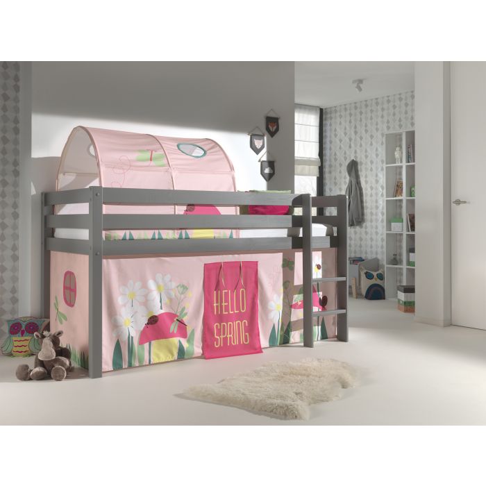 Deze PINO hoogslaper is vervaardigd van massief grenen en is grijs gelakt. De ladder kan zowel links als rechts gemonteerd worden. De lattenbodem is inbegrepen. De allround valbeveiliging, brede treden en goede stabiliteit maken dit bed heel veilig. De ruimte onder het bed kan gebruikt worden om te spelen of als opbergruimte. In het PINO gamma zijn verschillende mogelijkheden beschikbaar om dit bed aan te vullen met een bureau, bibliotheek, commodes, hangplankje of leuke textielset. Bij deze combinatie zijn een speelgordijn Spring en een tunnel Spring inbegrepen.