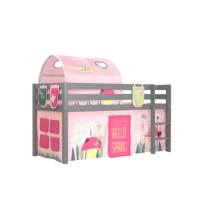 Deze PINO hoogslaper is vervaardigd van massief grenen en is grijs gelakt. De ladder kan zowel links als rechts gemonteerd worden. De lattenbodem is inbegrepen. De allround valbeveiliging, brede treden en goede stabiliteit maken dit bed heel veilig. De ruimte onder het bed kan gebruikt worden om te spelen of als opbergruimte. In het PINO gamma zijn verschillende mogelijkheden beschikbaar om dit bed aan te vullen met een bureau, bibliotheek, commodes, hangplankje of leuke textielset. Bij deze combinatie zijn een speelgordijn Spring, 3 zakjes Spring en een tunnel Spring inbegrepen.