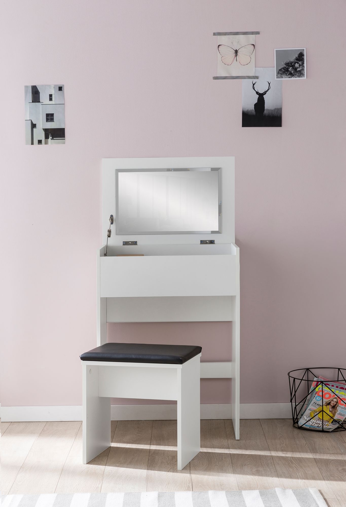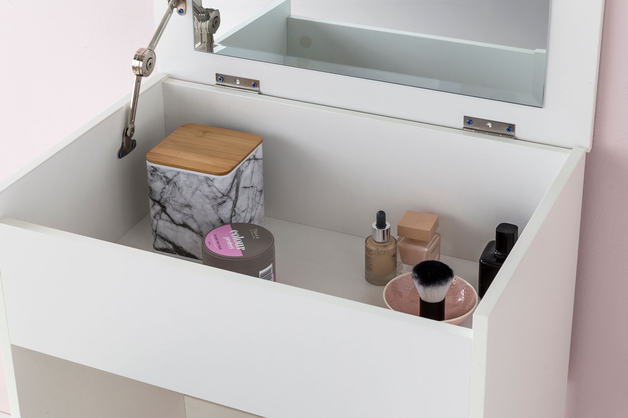 Deze moderne witte kaptafel wordt geleverd met een grote spiegel en een stijlvol tweekleurig krukje (zwart/wit). Het ruime klapvak biedt georganiseerde opbergruimte voor cosmetica, parfums en accessoires.