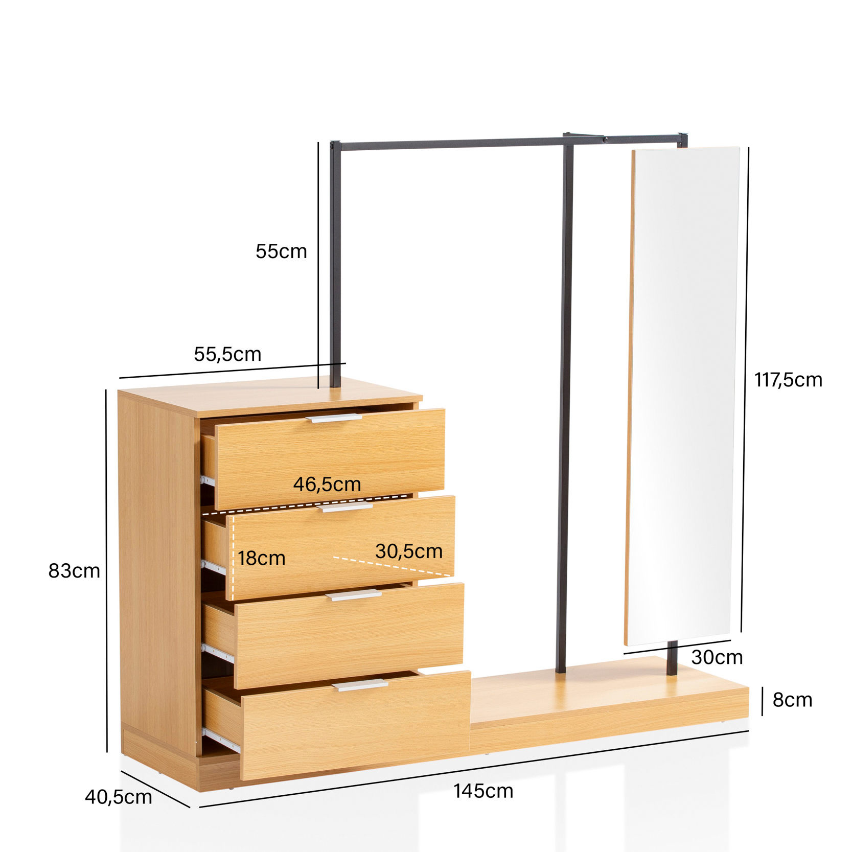 Moderne garderobe in eiken decor, perfect om schoenen, jassen, sjaals en mutsen in de hal te organiseren. Uitgerust met een ladekast met vier lades, kledingstang en geïntegreerde rechthoekige spiegel.