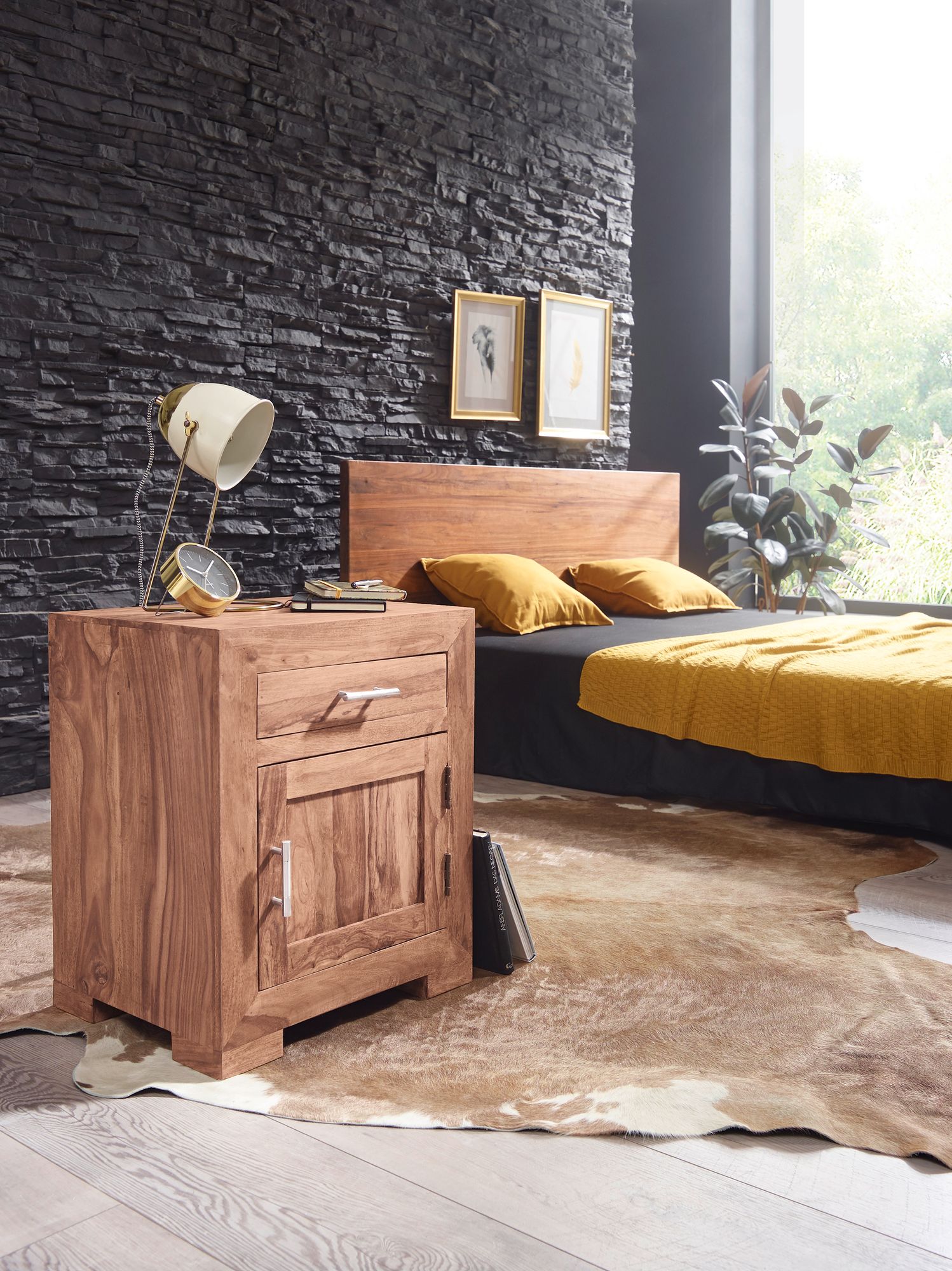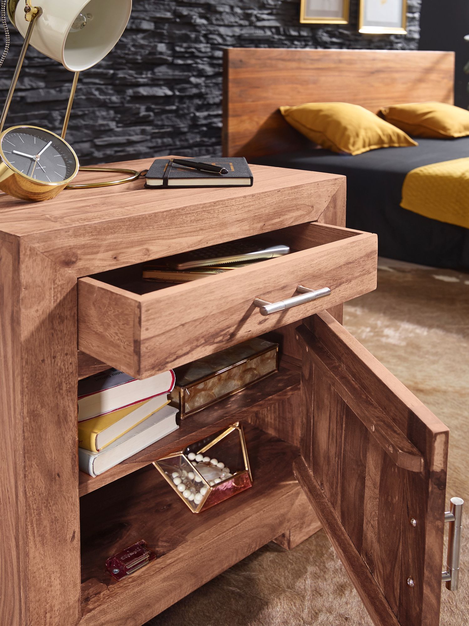 Breng een authentiek tintje aan uw slaapkamer met de MUMBAI nachtkastje gemaakt van massief acaciahout in een natuurlijke afwerking. Met een hoogte van 60 cm, breedte van 50 cm en diepte van 40 cm is hij ideaal voor boxspringbedden. Voorzien van een lade met stop om uitvallen te voorkomen en een deur met magneetsluiting, beide met elegante chromen metalen handgrepen.