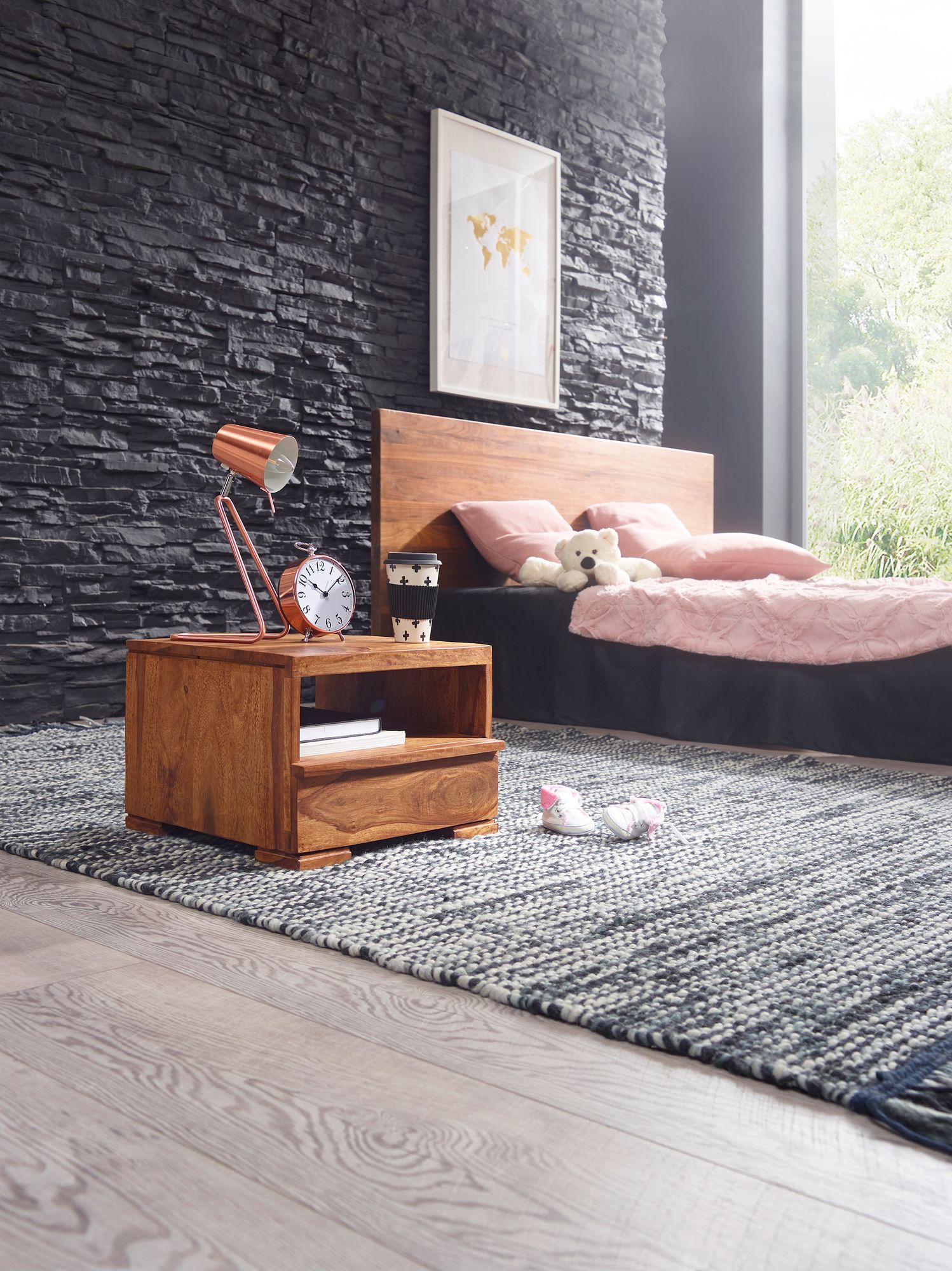 Compact en rustiek, de MUMBAI nachtkastje van massief Sheeshamhout valt op door zijn natuurlijke afwerking en mooie houtnerf. Perfect voor een landelijke stijl, met een functionele lade en een open opbergvak.