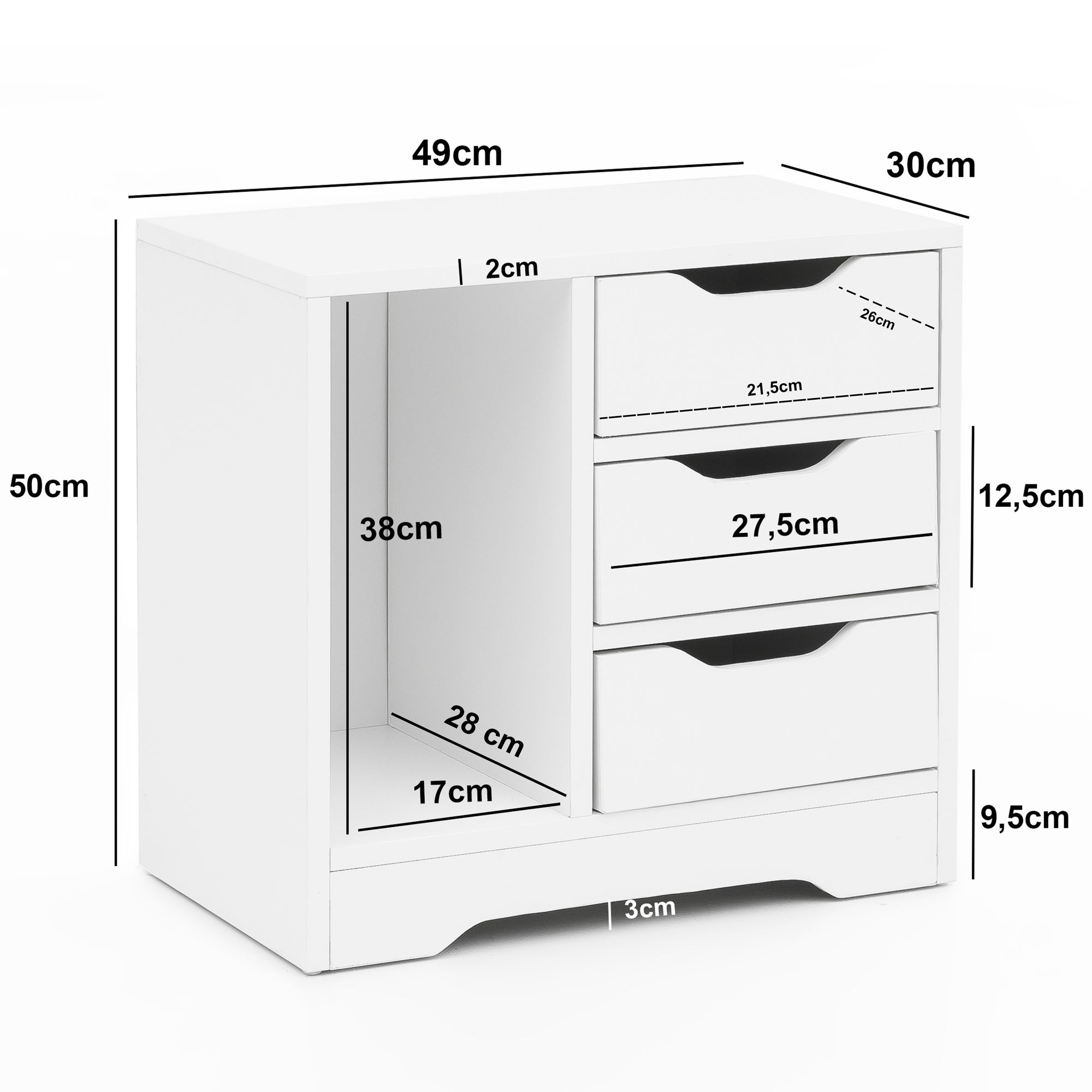 - Lades: 3 stuks, binnenmaat 21,5 x 12,5 x 26 cm