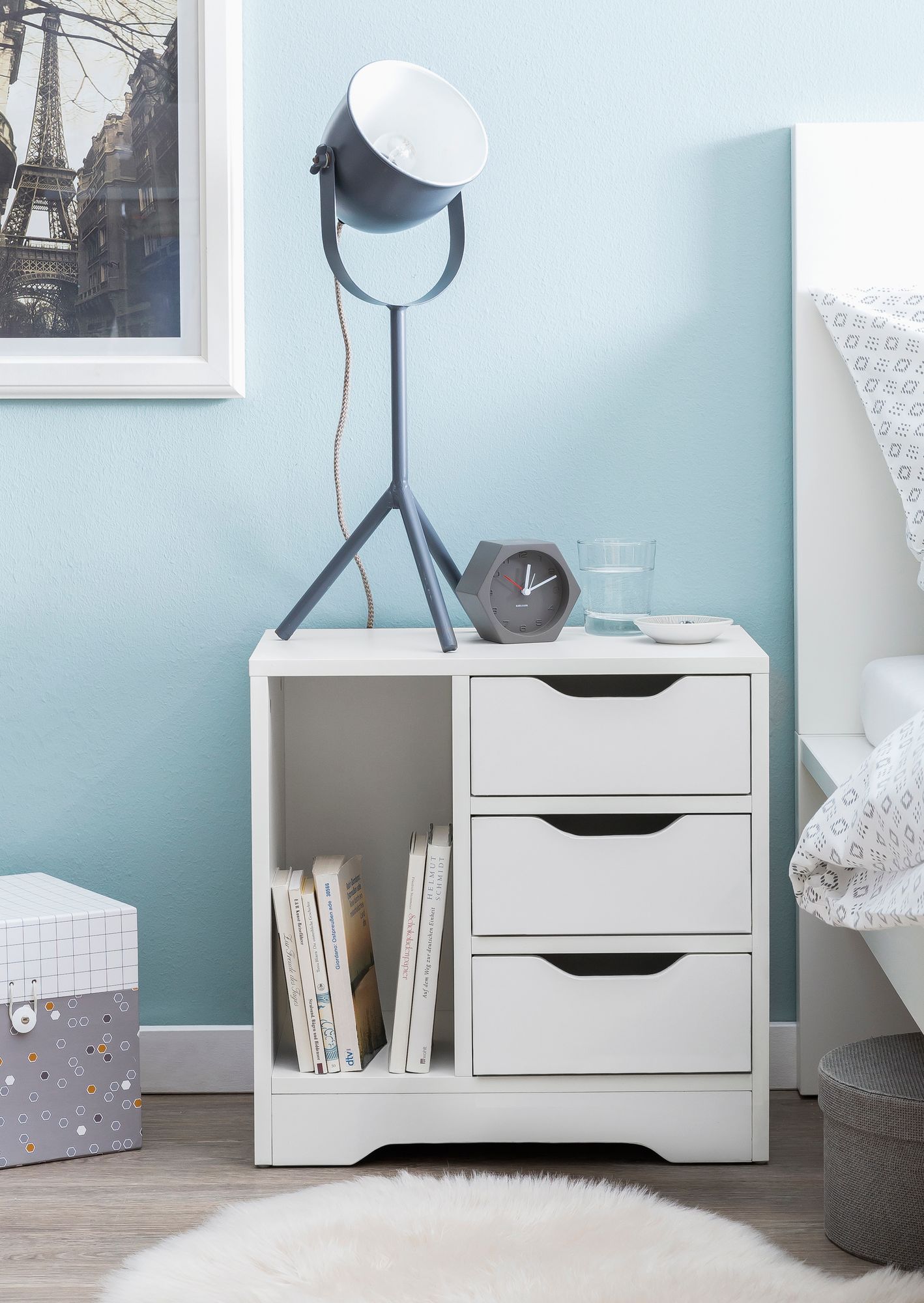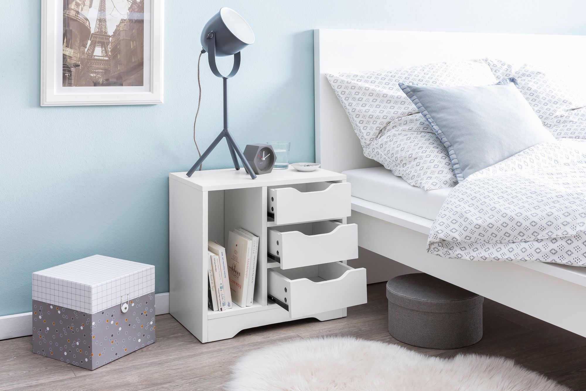 Dit mat witte nachtkastje biedt een stijlvolle en functionele oplossing met drie lades en één open vak, perfect om slaapkamerbenodigdheden netjes op te bergen en toch een strakke, moderne uitstraling te behouden.