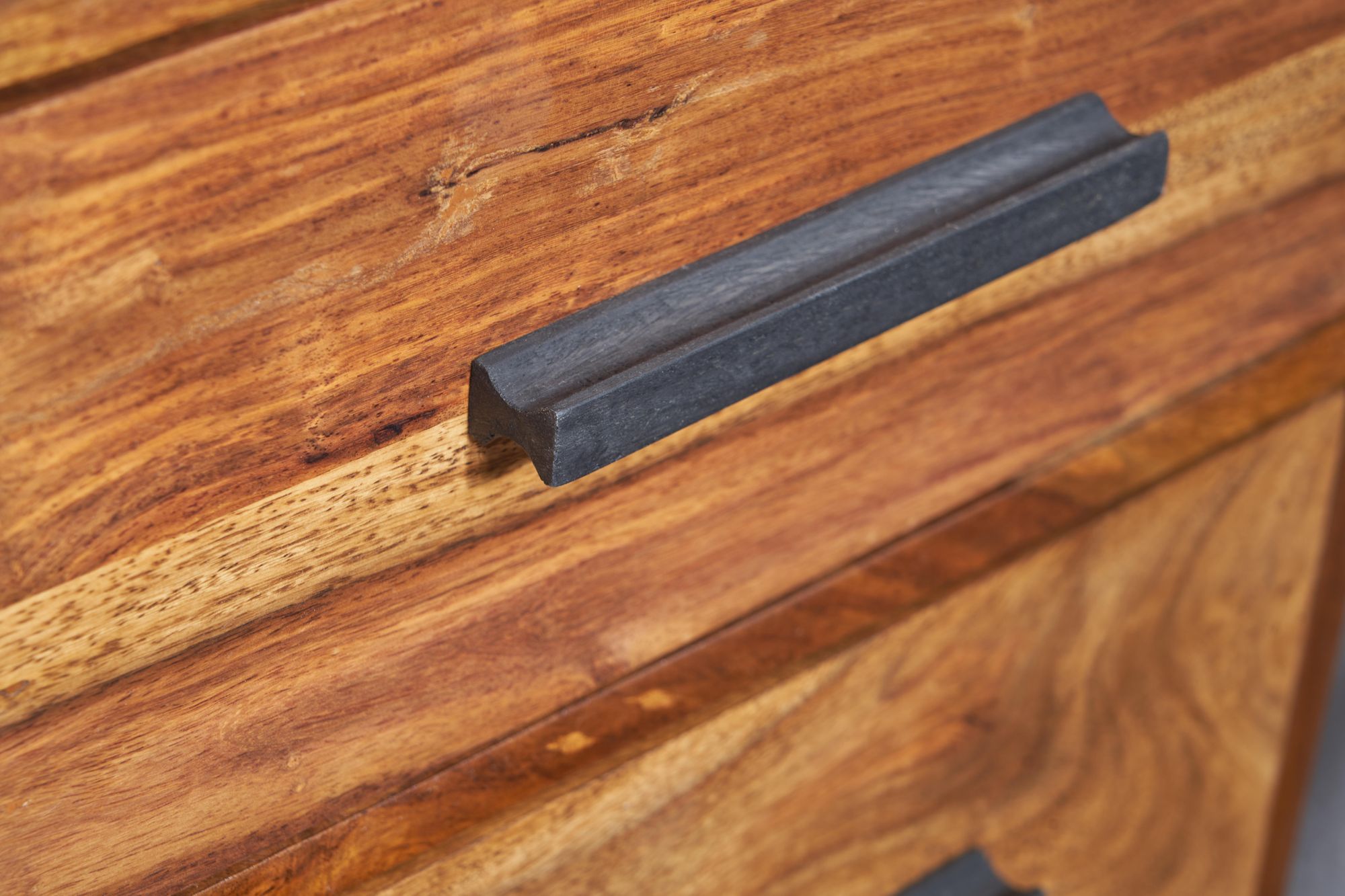 Deze nachtkast van massief Sheeshamhout en metaal past bij de industriële stijl met twee ruime lades en een open opbergruimte. Het moderne ontwerp gecombineerd met een stevig zwart metalen frame biedt een praktisch en esthetisch meubelstuk, ideaal voor boxspringbedden.