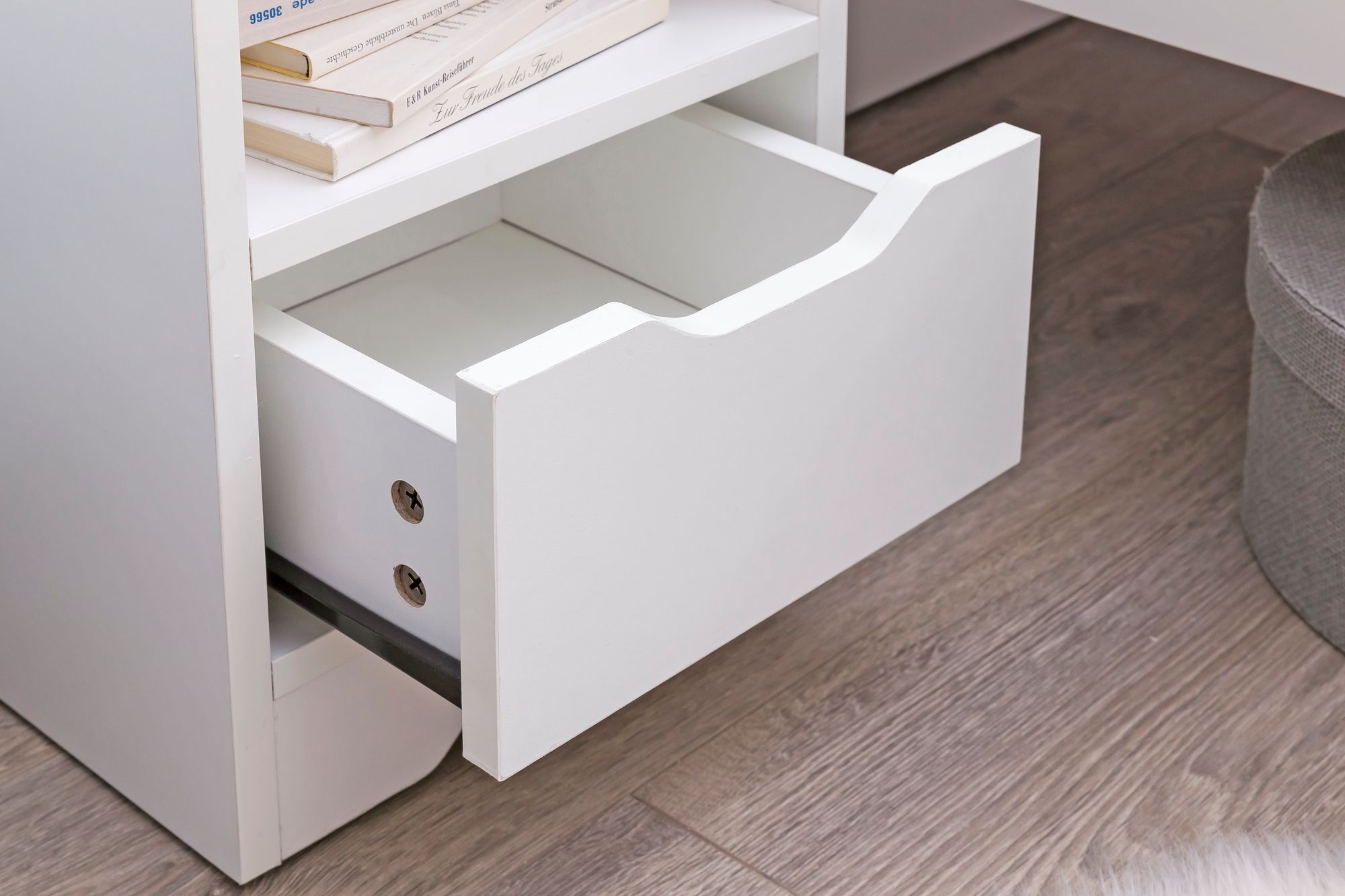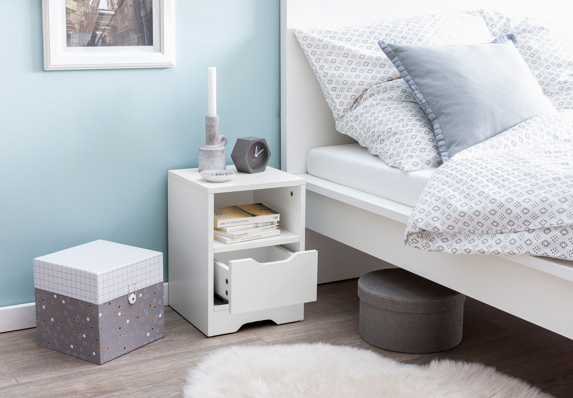 Deze witte matte nachtkast heeft een modern en tijdloos ontwerp, perfect voor gebruik in de slaapkamer. Met een ruime lade en een opbergvak organiseer je je persoonlijke spullen efficiënt.