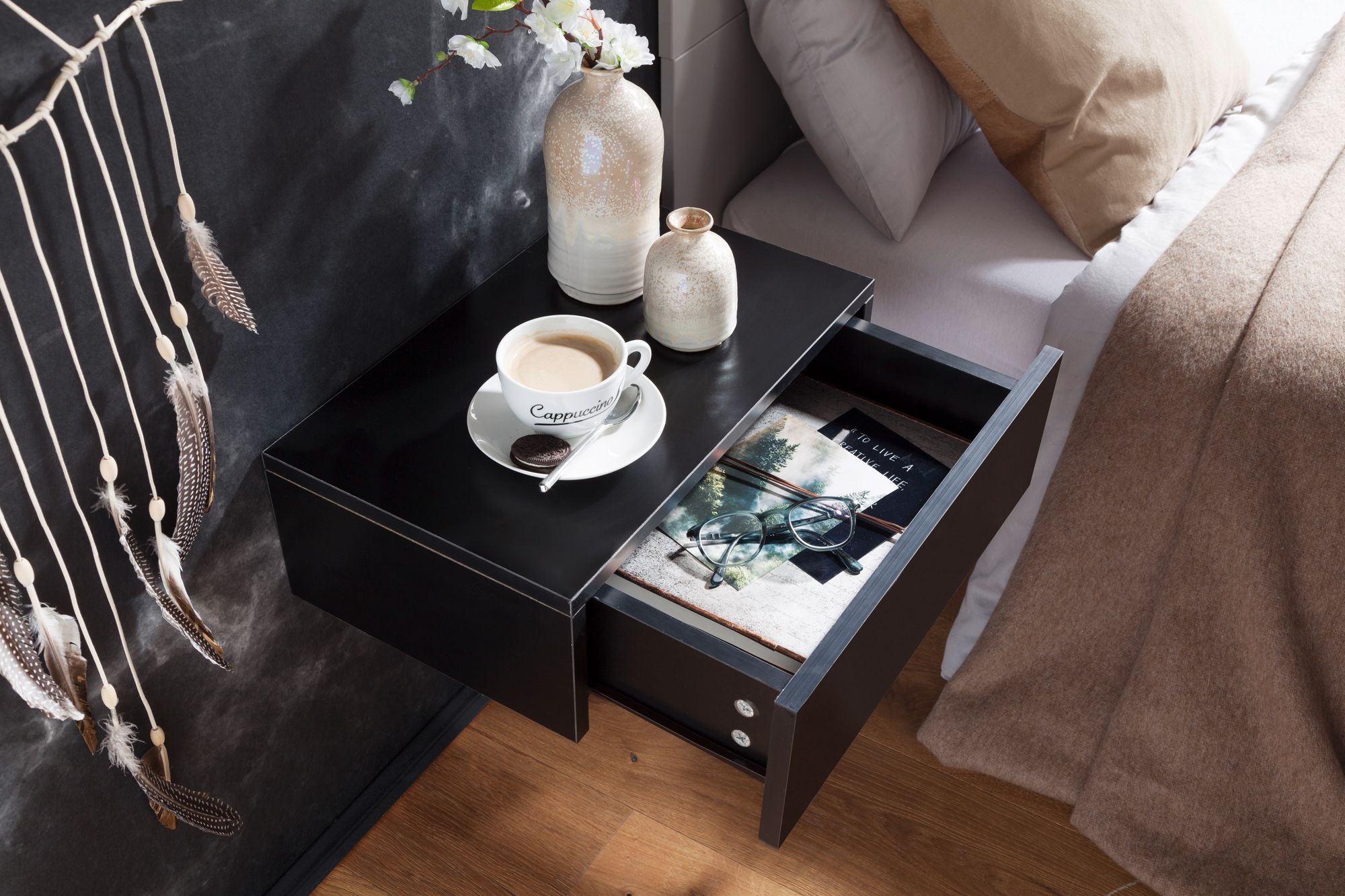 Nachtkastje zadar voor wandmontage 46x15x30cm zwart nachtkastje hout