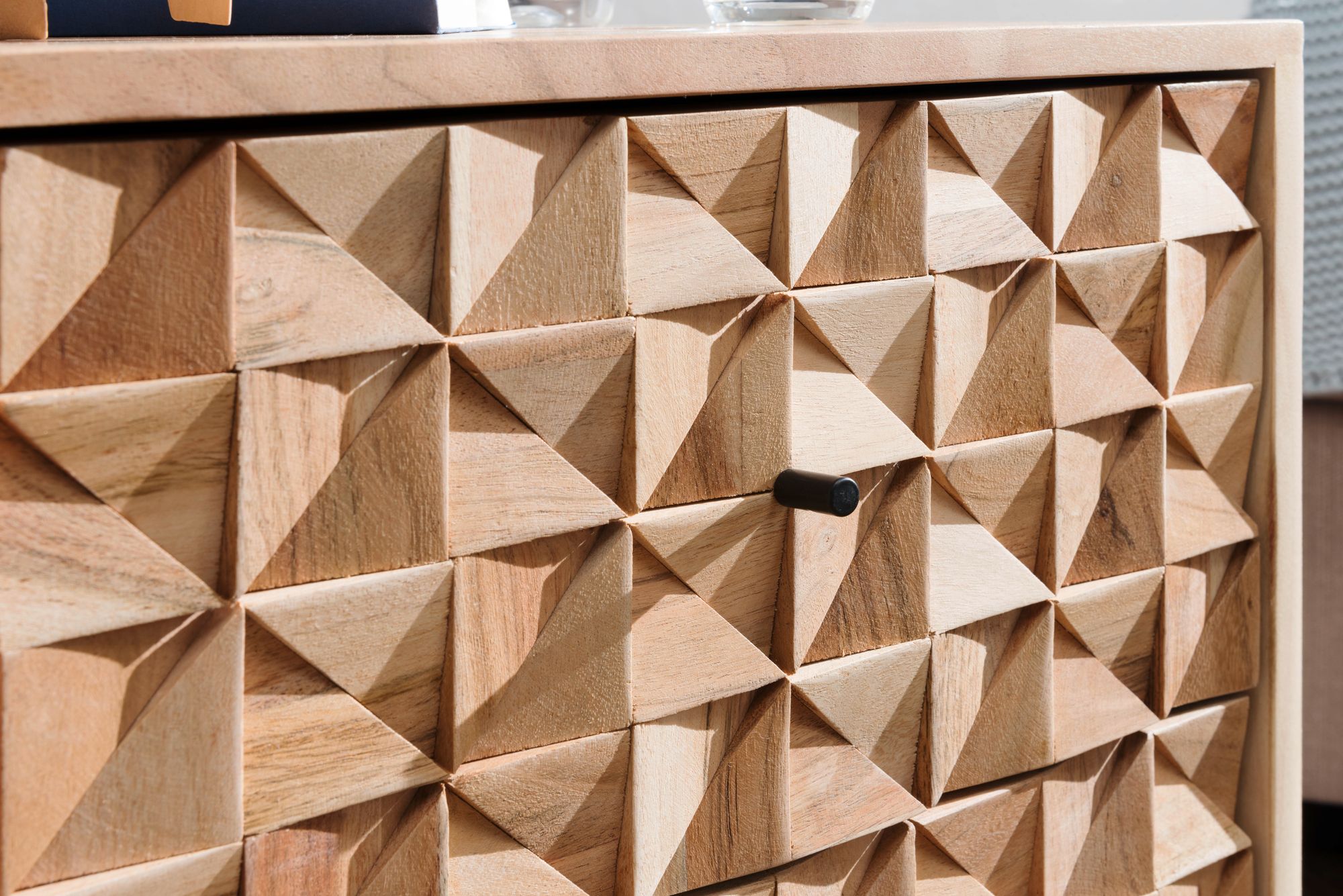 De handgemaakte afwerking benadrukt de natuurlijke houtnerf, aangevuld met zwarte metalen handgrepen die de stijl accentueren.