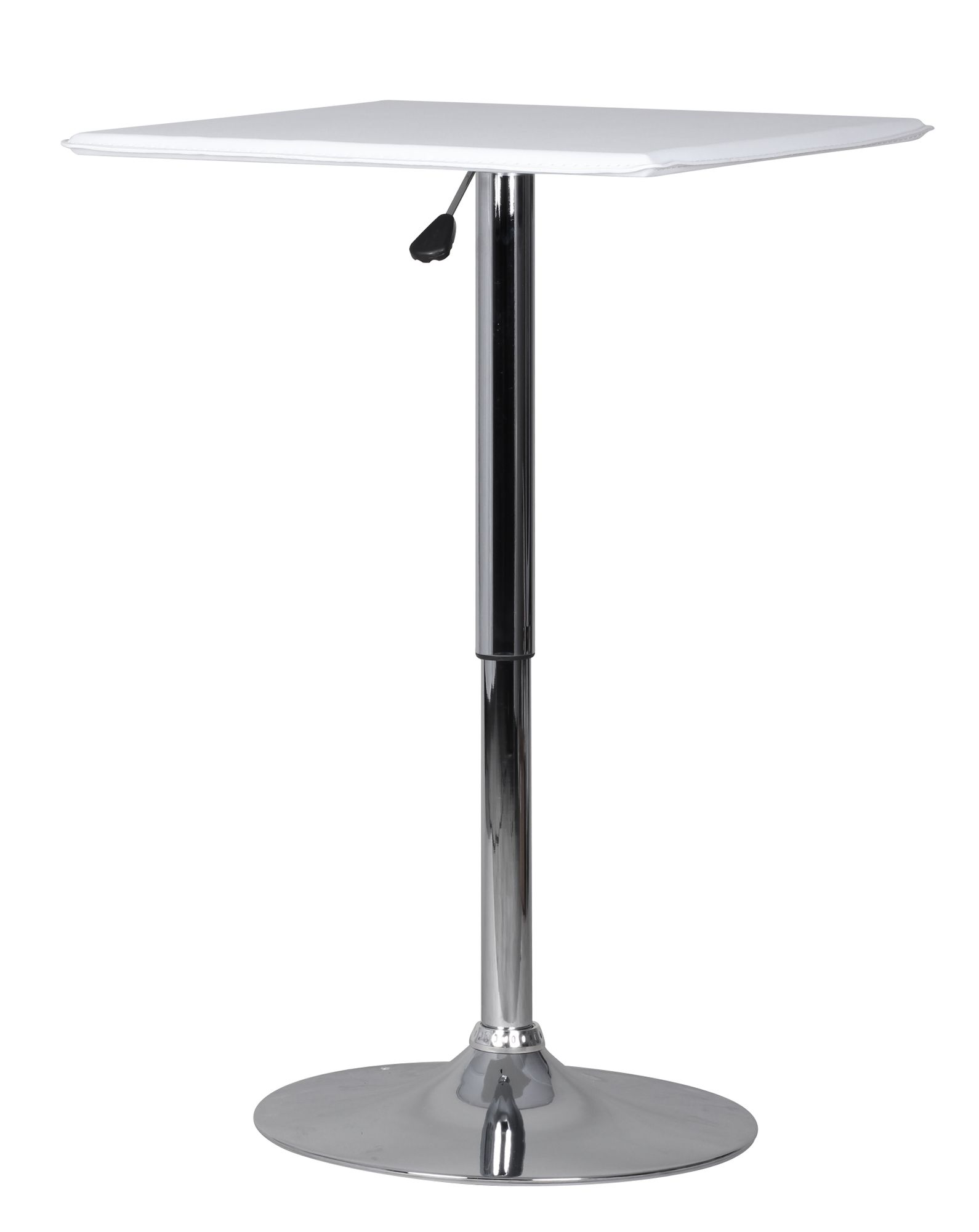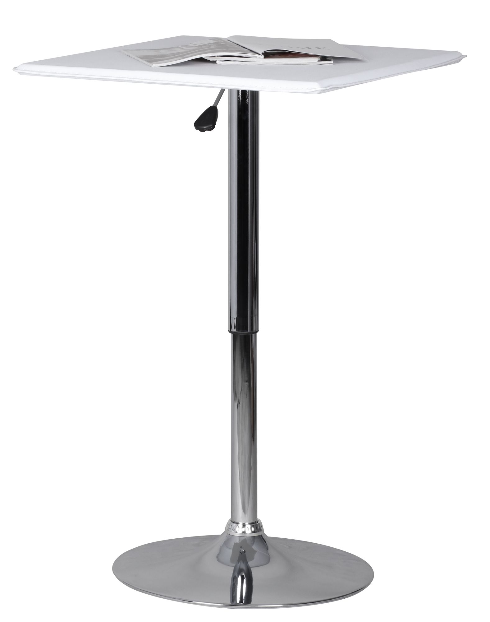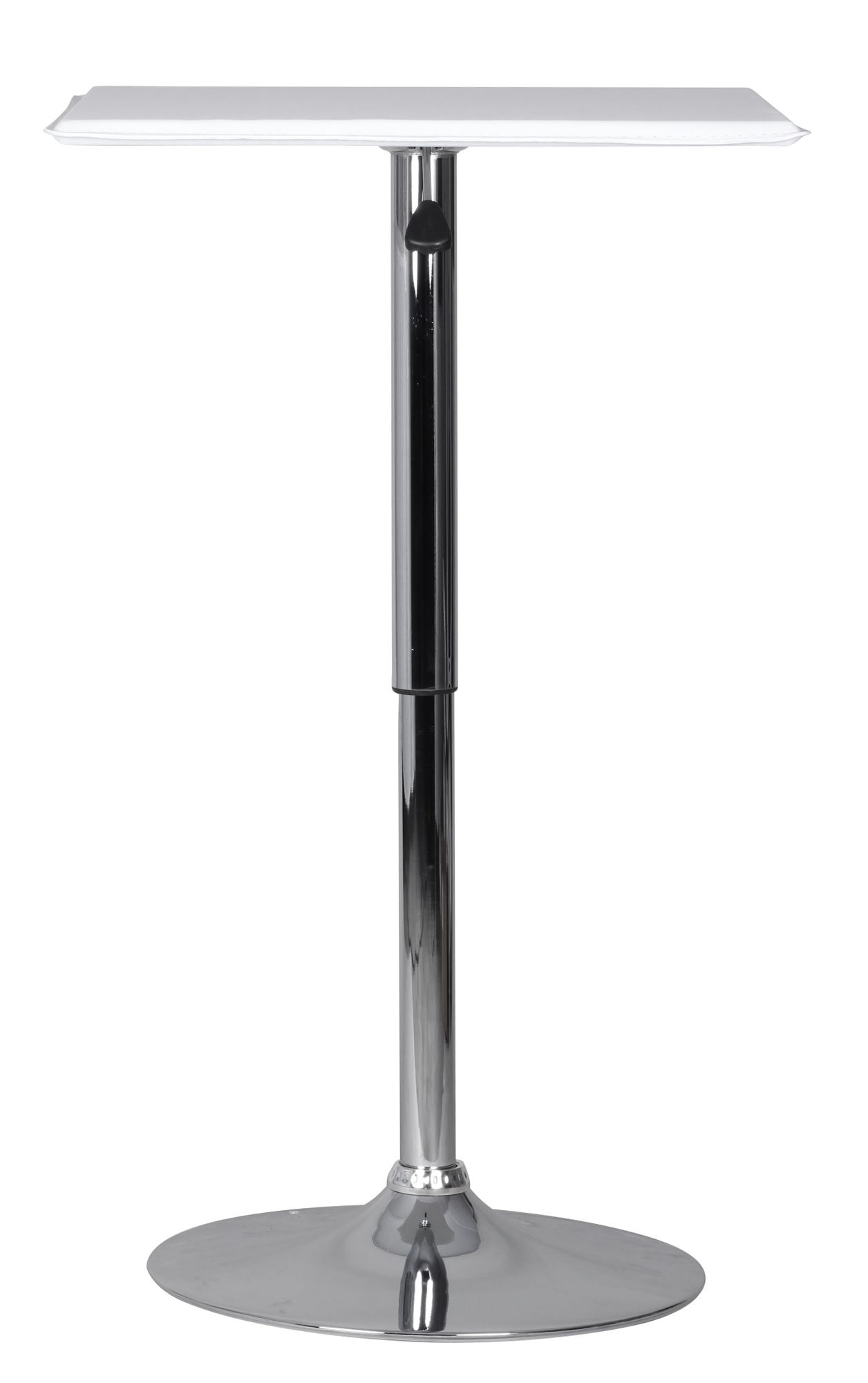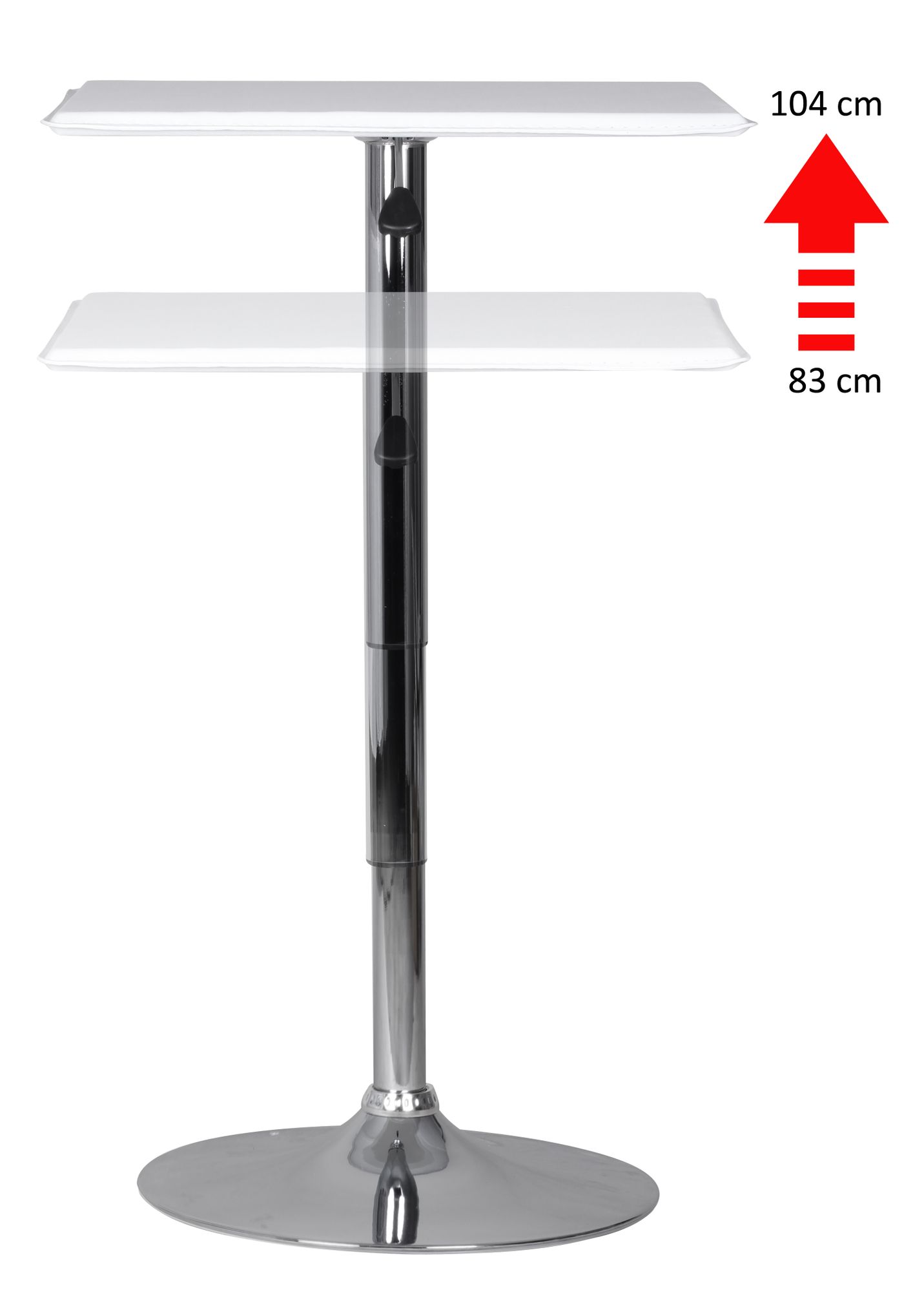 Deze verstelbare vierkante bartafel combineert functionaliteit met een modern design. Het tafelblad is bekleed met wit kunstleer en de stevige verchroomde trompetvoet zorgt voor stabiliteit. De hoogte is verstelbaar van 83 tot 104 cm en het tafelblad meet 63x63 cm.