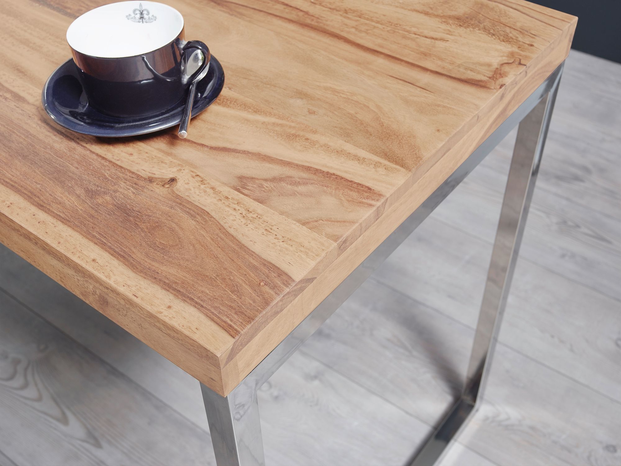 Het GUNA bureau van massief acaciahout biedt een perfecte combinatie van elegantie en duurzaamheid. Het natuurlijke houten blad met een heldere afwerking en het chromen metalen frame creëren een warme, moderne landelijke stijl.