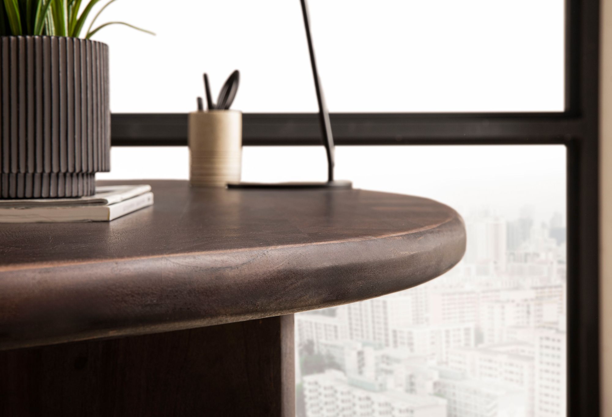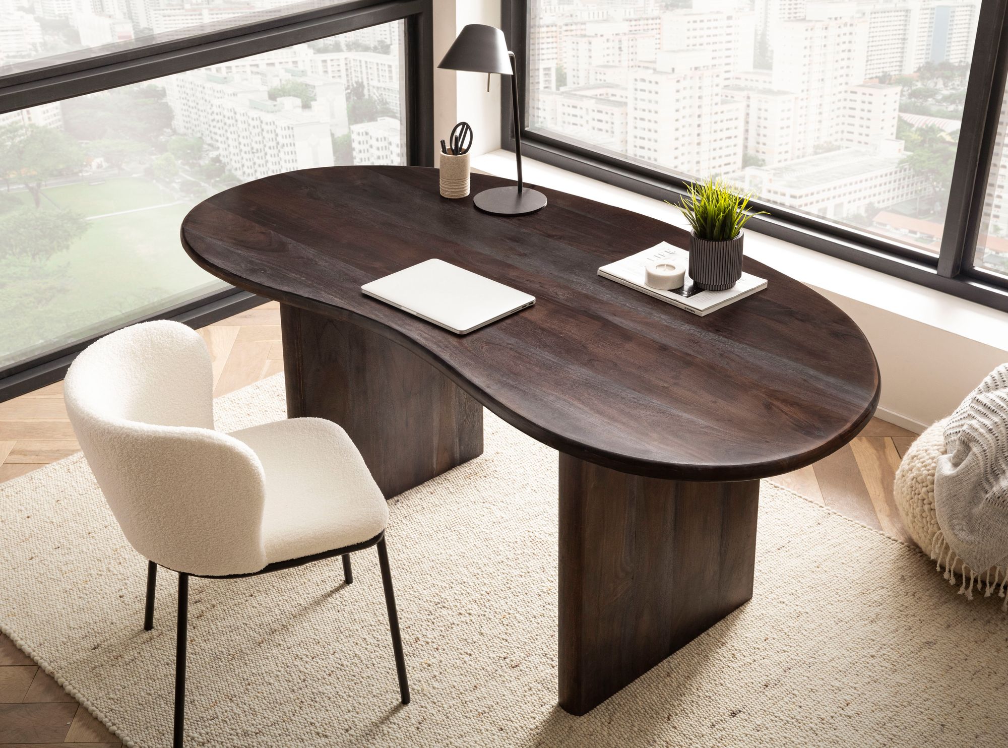 Ontdek dit massief acaciahouten bureau in retrostijl, perfect voor thuiswerken of kantoor. Het nier-vormige tafelblad met natuurlijke houtnerf geeft een warme en unieke uitstraling.